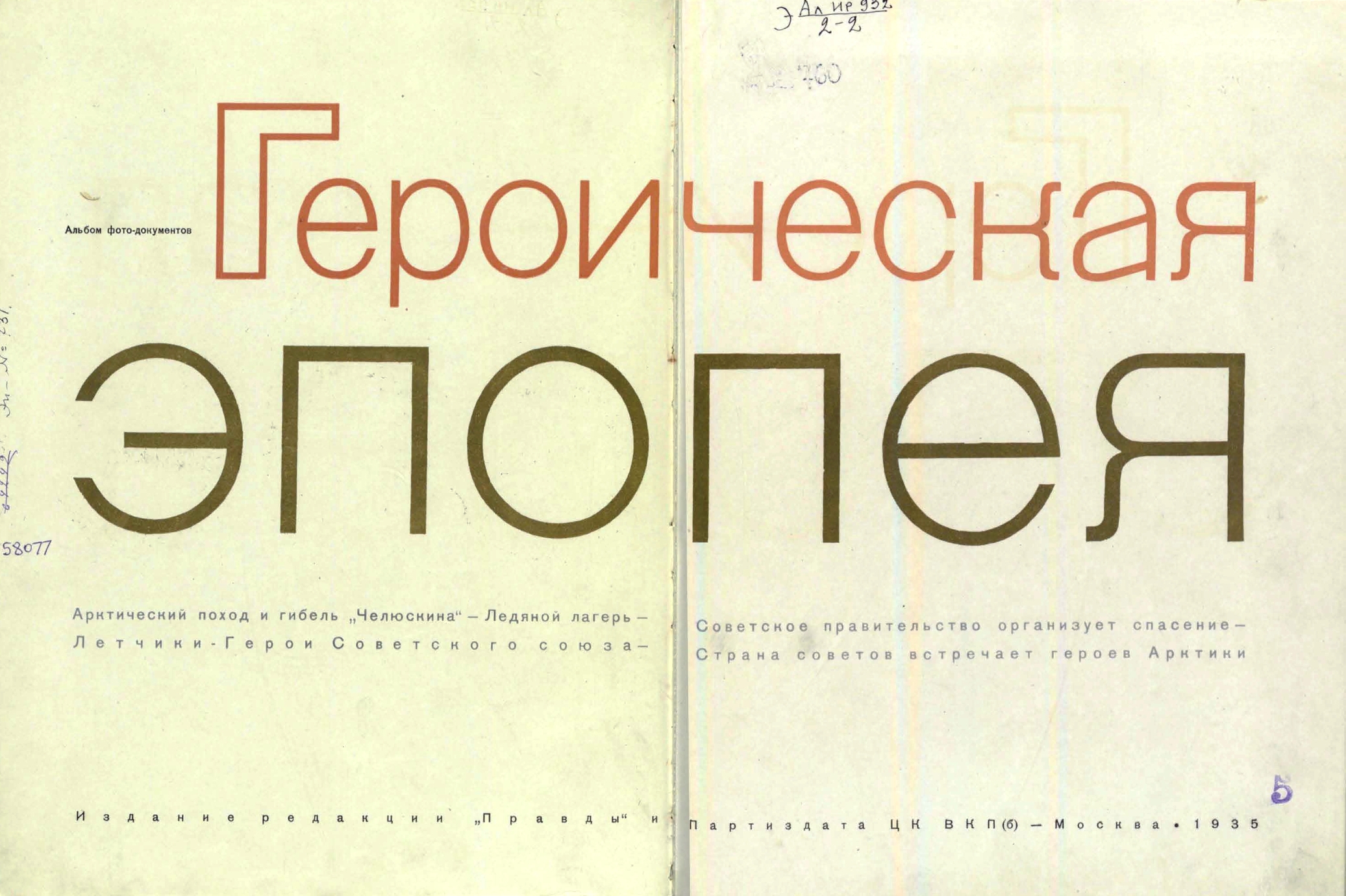 Героическая эпопея: Альбом фотодокументов. Под ред. Л. Мехлиса, И. Веритэ, И. Богового, И. Баевского; Худ. построение и оформление Худ. П. Фрейберг; Худ. С. Телингер; Худ. Н.Седельников Москва Издание редакции «Правды» и Партиздата ЦК ВКП(б). 1935г. — 194 с.