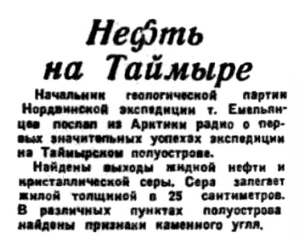 Начальник геологической партии Нордвикской экспедиции т. Емельянцев поспал из Арктики радио о первых значительных успехах экспедиции на Таймырском полуострове.