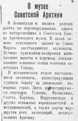 Арктический институт приступил к организации Музея Арктики в Ленинграде. Намечены отделы: физико-географический, Ледовитого моря, деятельности человека в Арктике, использования ее производительных сил, а также исторический. Музей уже располагает довольно значительным количеством экспонатов, часть которых представляет большую ценность как уники; имеется много картин Арктики. Временно, до получения соответствующего помещения, музей будет функционировать в виде полярного отдела существующего Географического музея.
