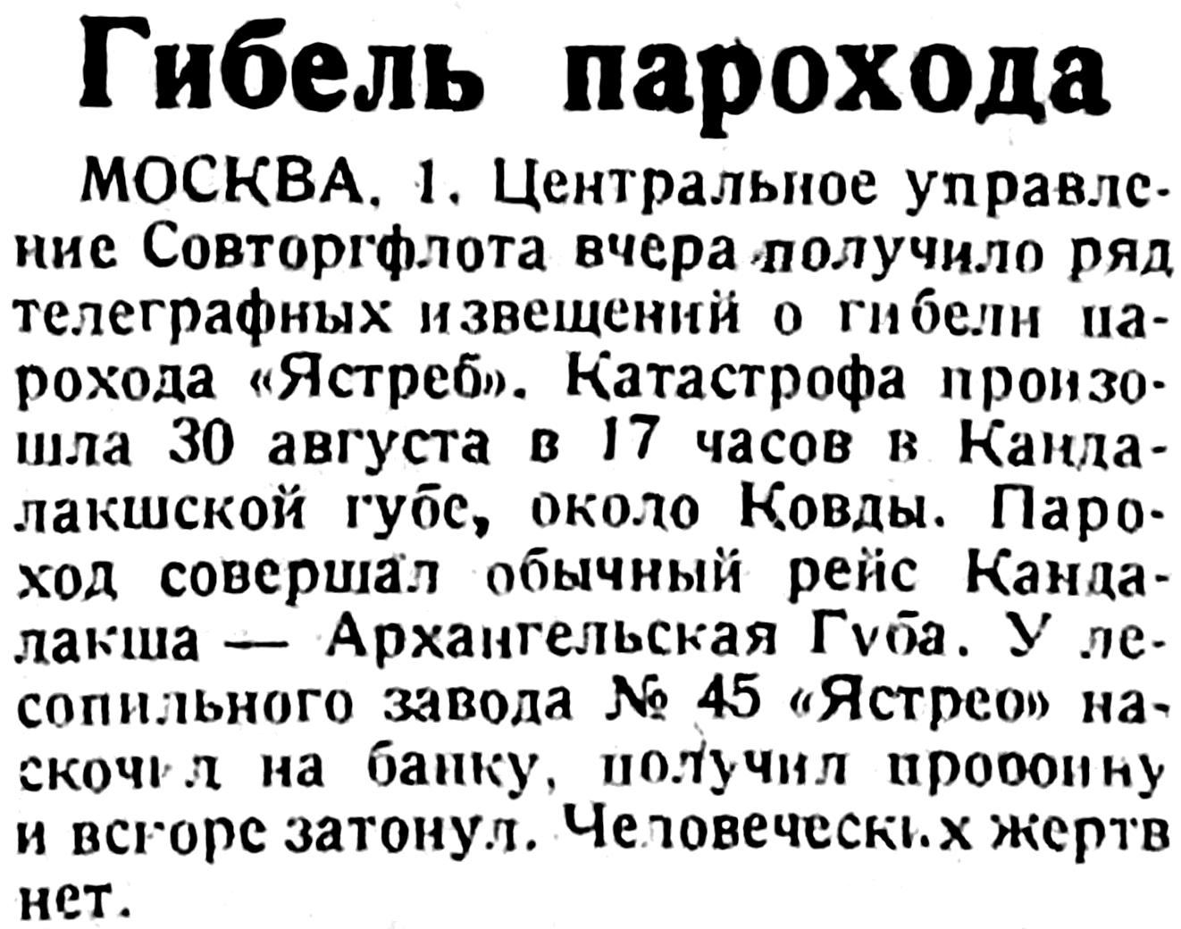 МОСКВА. 1. Центральное управление Совторгфлота вчера получило ряд телеграфных извещений о гибели парохода «Ястреб». Катастрофа произошла 30 августа в 17 часов в Кандалакшской губе, около Ковды. Пароход совершал обычный рейс Кандалакша — Архангельская Губа. У лесопильного завода № 45 «Ястреб» наскочил на банку, получил пробоину и вскоре затонул. Человеческих жертв нет.
