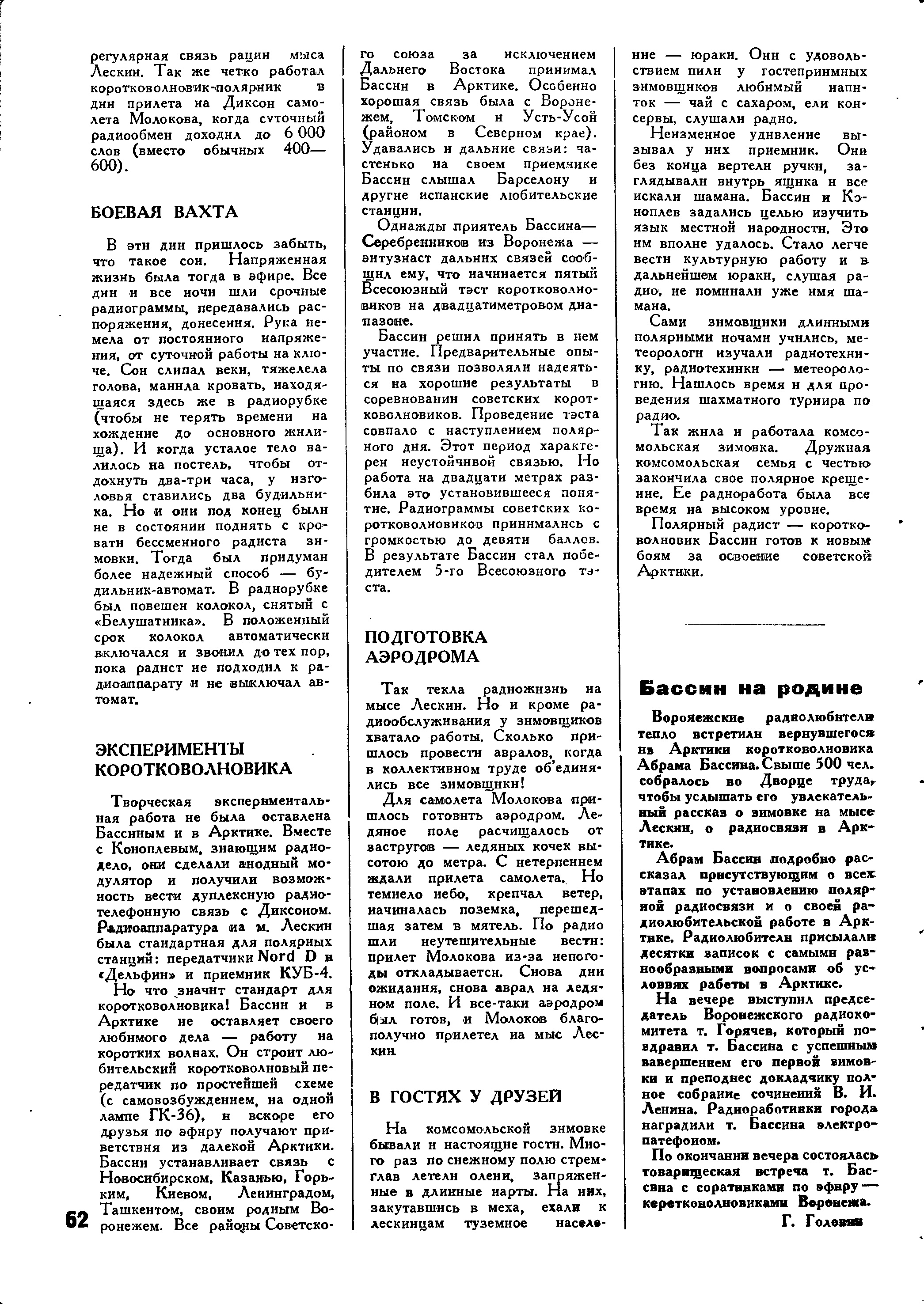 Самый активный воронежский радиолюбитель-коротковолновик т. А. Бассин уехал в Арктику. Узнав о решении ЦК ВЛКСМ послать 200 комсомольцев добровольцев на постоянную работу в Арктику, он немедленно подал заявление и был принят для посылки на один из ответственнейших участков арктической радиосвязи. Бассин уехал работать старшим радиотехником на мыс Лескин, где будет построена первая образцовая комсомольская станция.