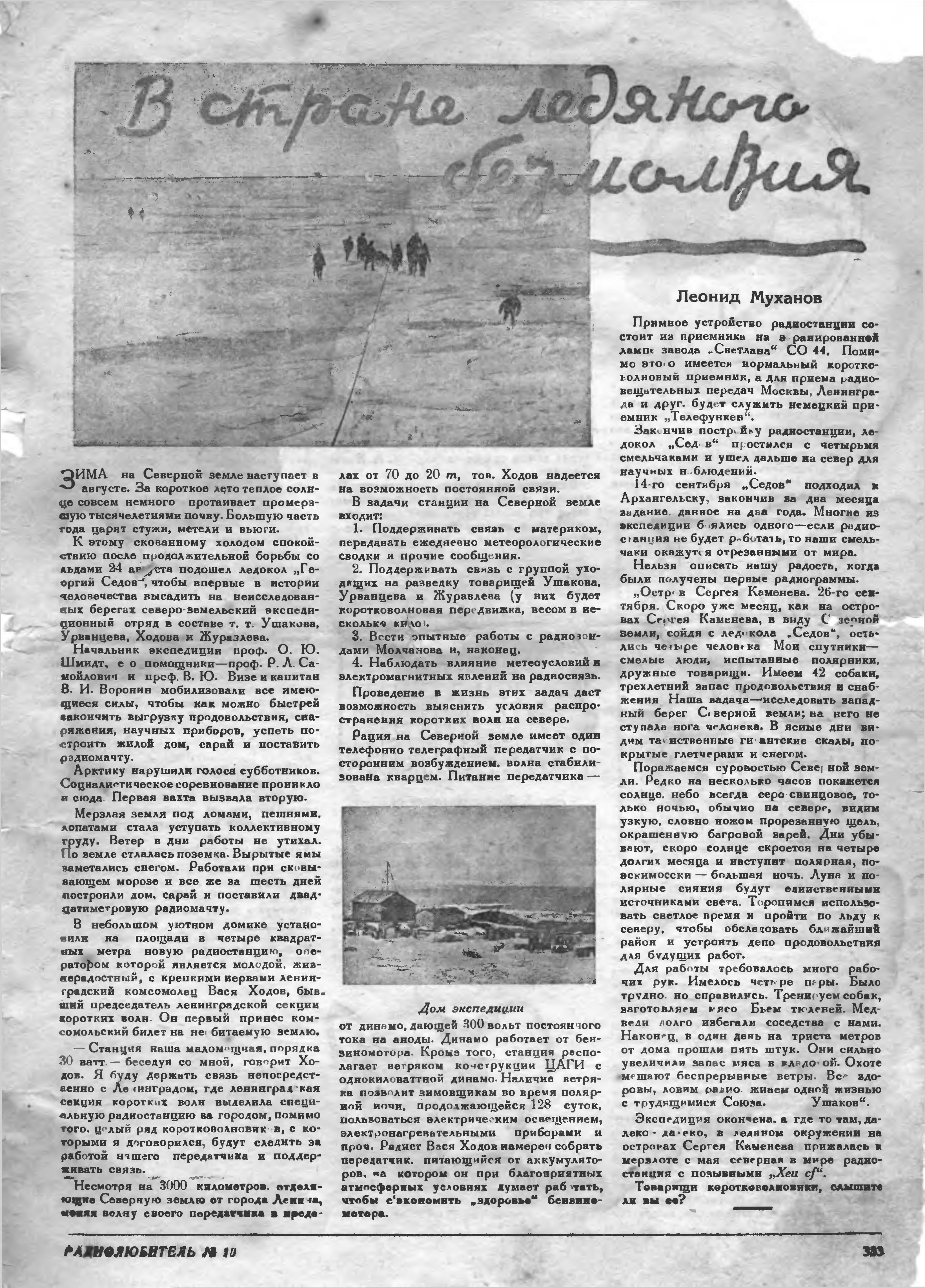 В небольшом уютном домике установили на площади в четыре квадратных метра новую радиостанцию, оператором которой является молодой, жизнерадостный, с крепкими нервами ленинградский комсомолец Вася Ходов, бывший председатель ленинградской секции коротких волн. Он первый принес комсомольский билет на необитаемую землю.