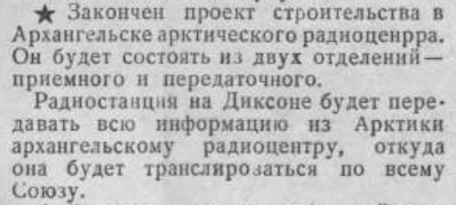 Начаты работы по проектированию строительства в Архангельске мощною радиоузла Главсевморпути. Радиоузел явится основным центром., связывающим Арктику с материком и Москвой.