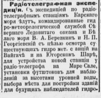 Группа зимовщиков под руководством КРЕНКЕЛЯ выехала из Архангельска на краснознаменном ледоколе «Сибиряков» в середине июля. Работу радиостанции предполагается начать во второй половине августа.