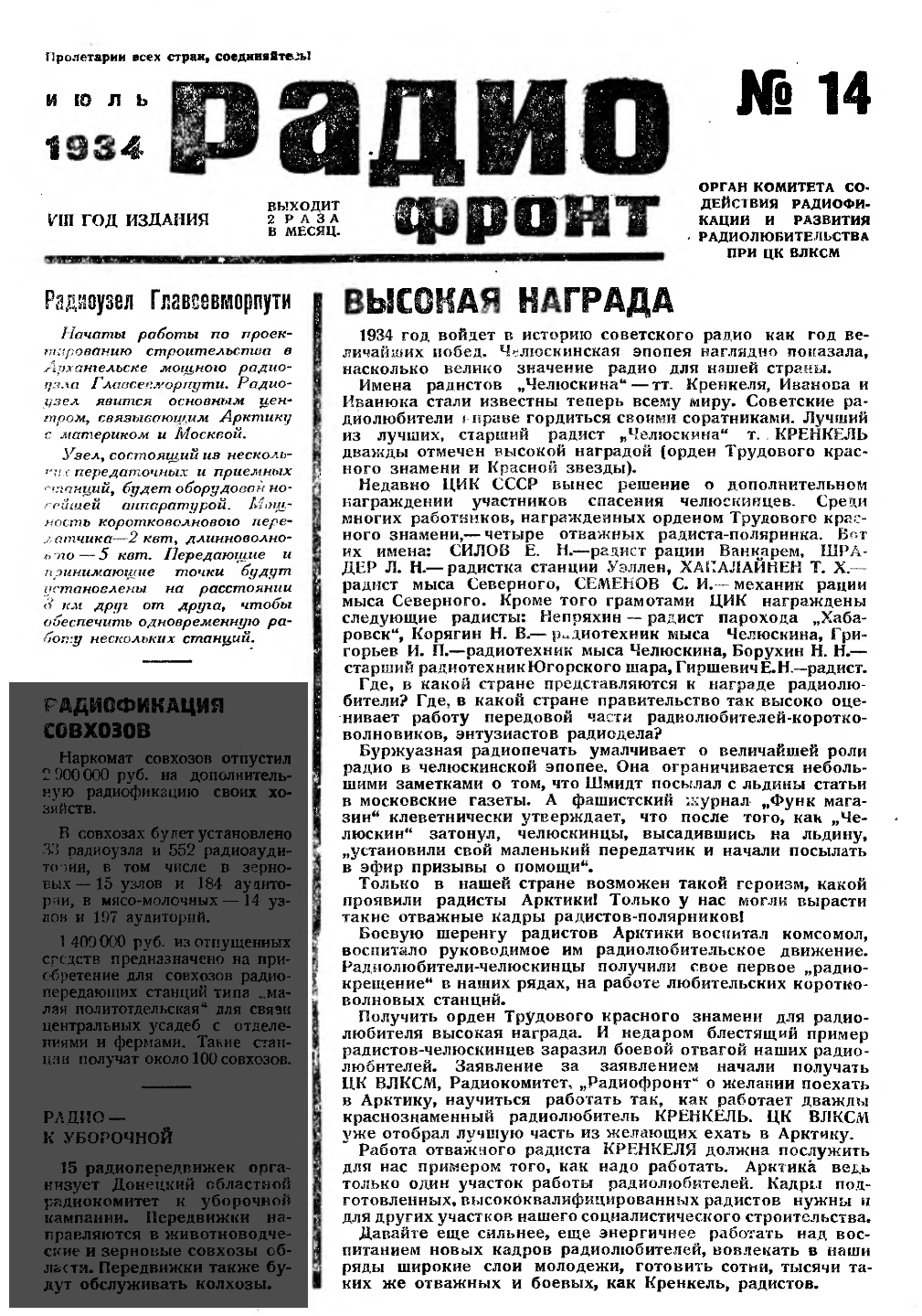 1934 год войдет в историю советского радио как год величайших побед. Челюскинская эпопея наглядно показала, насколько велико значение радио для нашей страны.