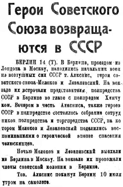 БЕРЛИН 14 (Т). В Берлине, проездом из Лондона в Москву, находилась начальник военно воздушных сил СССР т. Алкснис, герои советского союза Молоков и Леваневский. На вокзале их встречали представители полпредства СССР в Берлине во главе с полпредом Ханчуком. Вечером в честь Алксниса, также героев СССР в полпредстве состоялось собрание сотрудников полпредства и торгпредства СССР, на котором Молоков и Леваневский поделились воспоминаниями о героической эпопее спасения челюскинцев.
