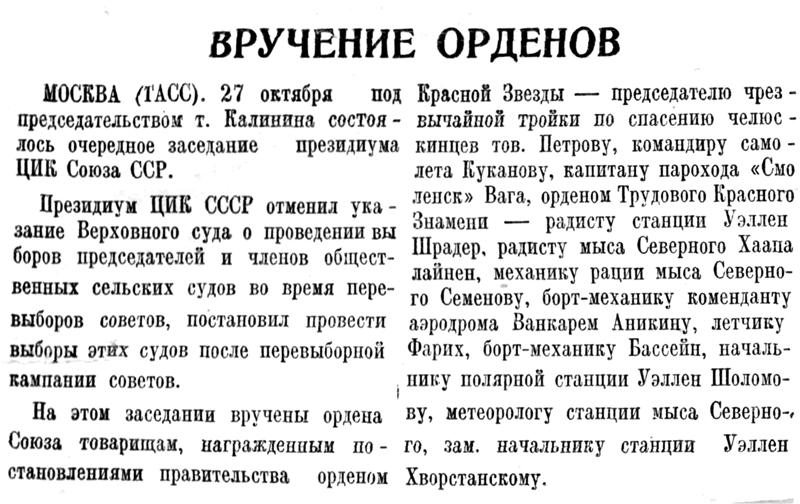 На этом заседании вручены ордена Союза товарищам, награжденным постановлениями правительства орденом Красной Звезды — председателю чрезвычайной тройки по спасению челюскинцев тов. Петрову, командиру самолета Куканову, капитану парохода «Смоленск» Вага, орденом Трудового Красного Знамени — радисту станции Уэллен Шрадер, радисту мыса Северного Хаапалайнен, механику рации мыса Северного Семенову, борт-механику коменданту аэродрома Ванкарем Аникину, летчику Фарих, борт-механику Бассейн, начальнику полярной станции Уэллен Шоломову, метеорологу станции мыса Северного, зам. начальнику станции Уэллен Хворстанскому.