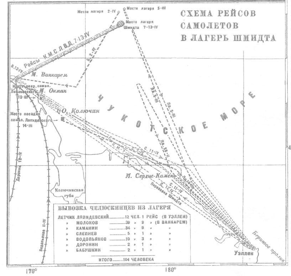 Условными знаками показаны принимавшие участие в спасении челюскинцев: корабли, дирижабли, самолеты . Показаны маршруты полетов самолетов и подписаны фамилии летчиков