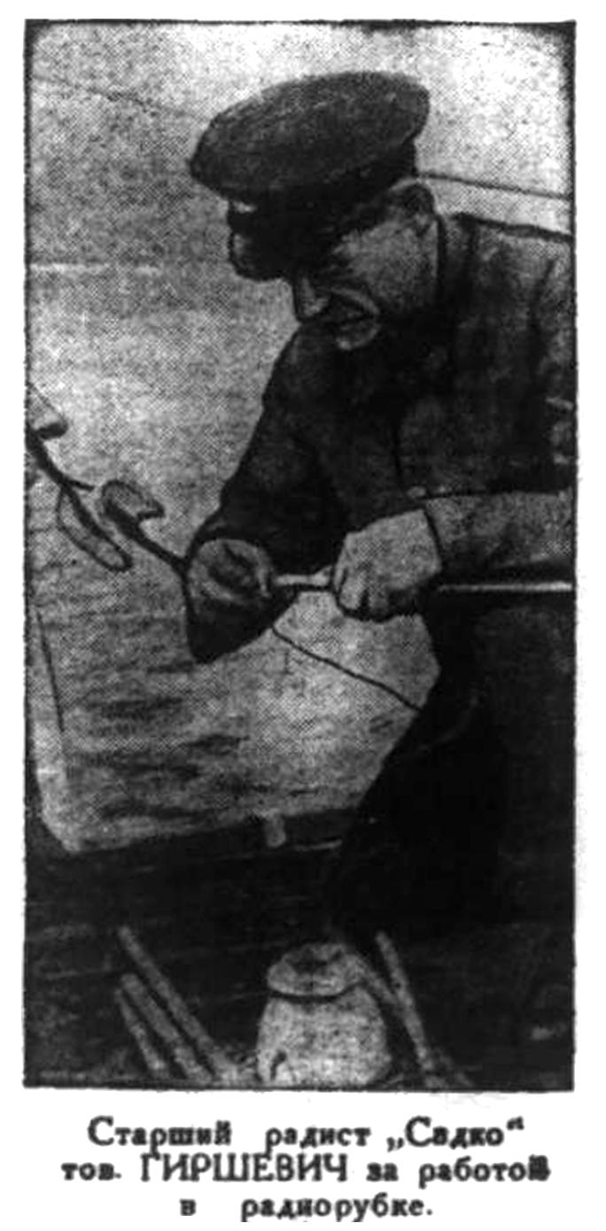 «Судовой «наркомпочтель» радист Гиршевич – любимец всего экипажа. Это он доставляет радость получения весточки с родины и поддерживает постоянную связь с берегом. Благодаря его станции, где бы мы ни находились – затёртые во льдах или в открытом бурном океане – всегда имеем постоянную возможность снестись с далекими семьями. Гиршевич – энтузиаст своего дела. Посмотрите, как зажигается его лицо, как радостно вспыхивают и блестят глаза, когда он показывает вам свою гордость – новую радиотелефонную установку. На круглых металлических часах черная стрелка медленно подбирается к цифре два. Сейчас начнется передача метеорологической сводки на материк. Каждый день регулярно в радиобудке проявляется профессор Визе и приносит маленький лист бумаги, исчерченный столбцами непонятных многозначных цифр. И каждый день Гиршевич или его помощник Ворожцов посылают в туманную даль непонятные точки, тире, которые там, в Москве и Ленинграде, превратятся в стройные газетные фразы бюро предсказания погоды».