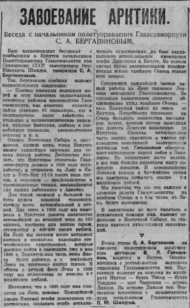 Вчера утром С. А. Бергавинов на самолете пилотируемом заслуженным летчиком В. Л. Галышевым, вылетел в Якутск. Ознакомившись с деятельностью якутского отделения Главсевморпути тов. Бергавинов вылетит на зимовки по маршруту Якутск — бухта Тикси — бухта Нордвик — мыс Челюскин — остров Диксон. На острове Диксон тов. Бергавинов встретится с прилетающим туда начальником Главсевморпути О. Ю. Шмидтом.