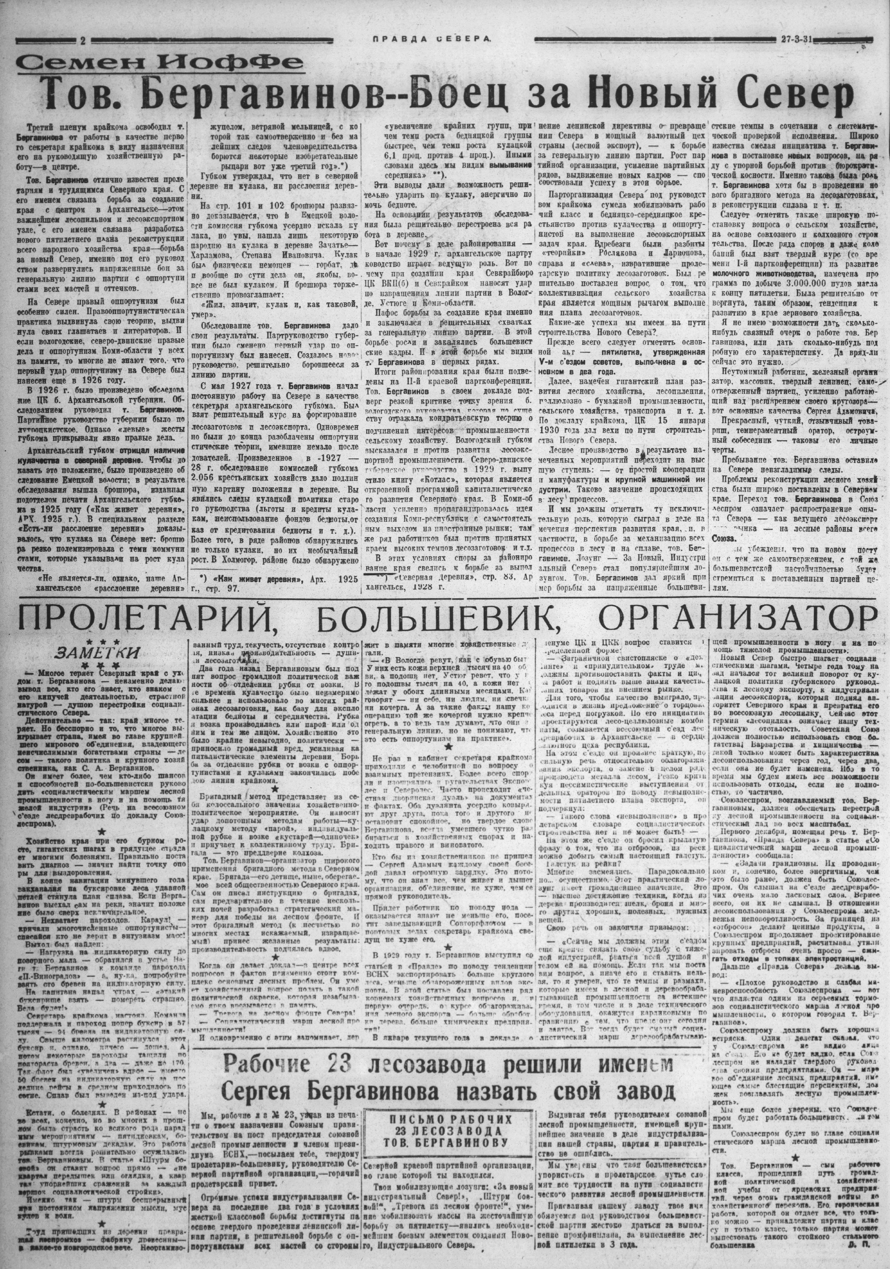 "Правда Севера" к отъезду т. Бергавинова помещает ряд статей. В передовой «Правда Севера» пишет: