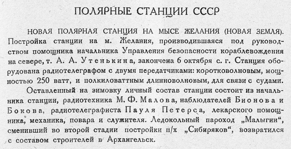 Постройка станции на м. Желания, производившаяся под руководством помощника начальника Управления безопасности кораблевождения на севере, т. А. А. Утенькина, закончена 6 октября с. г. Станция оборудована радиотелеграфом с двумя передатчиками: коротковолновым, мощностью 250 ватт, и полкиловаттным длинноволновым, для связи с судами.