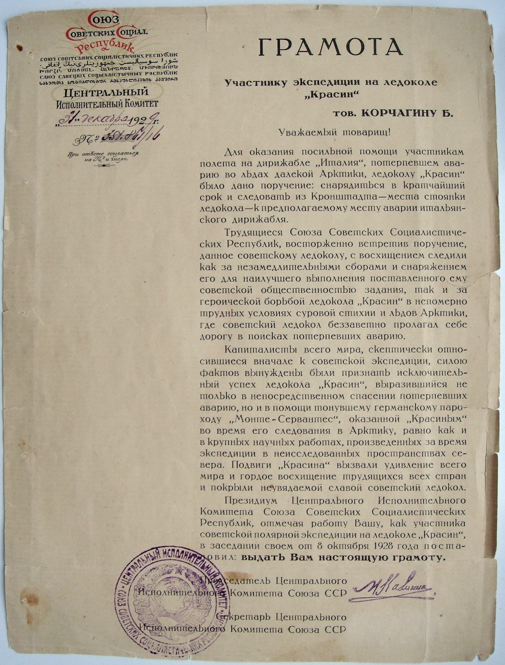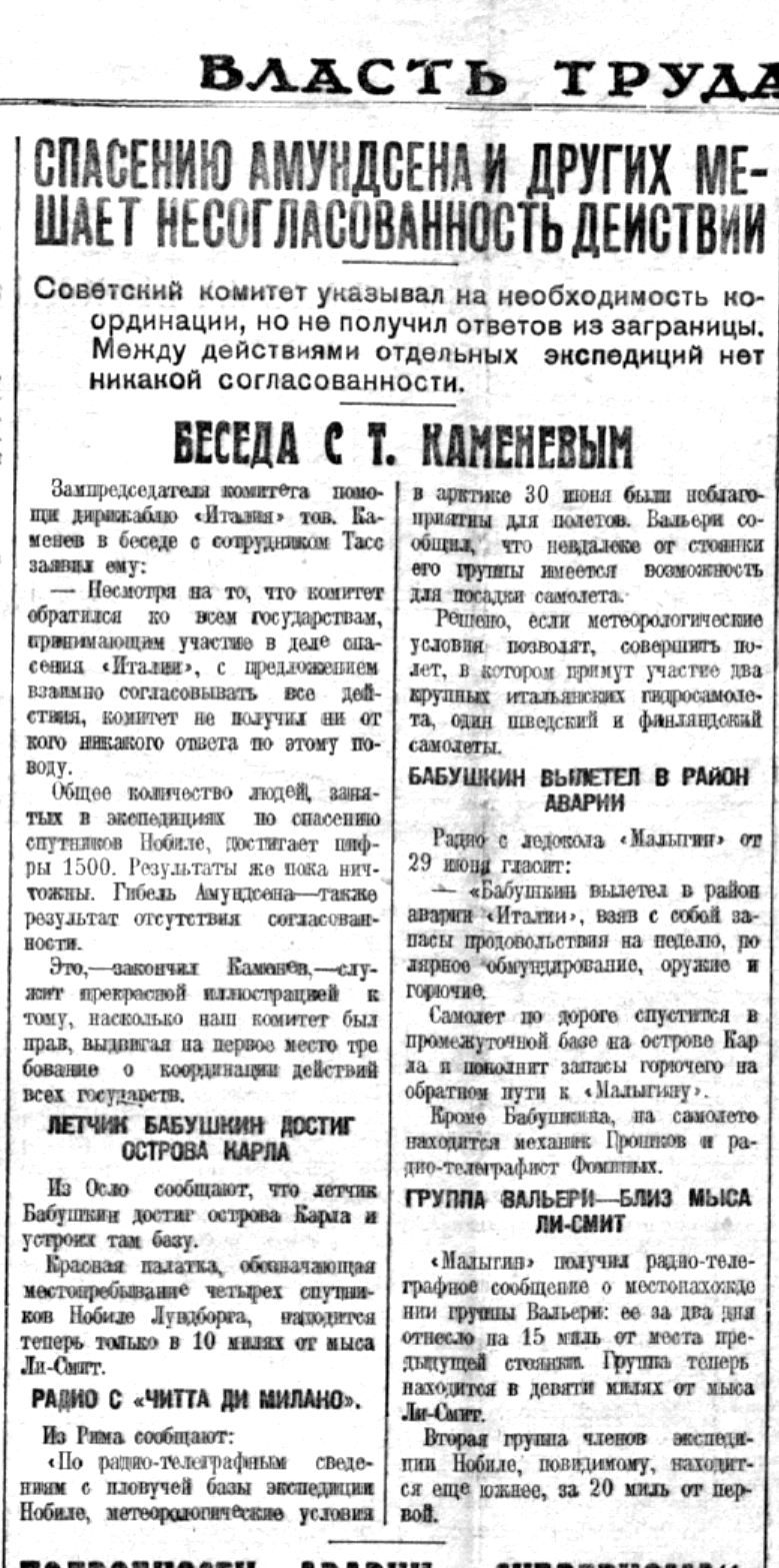 Зампредседателя комитета помощи дирижаблю «Италия» тов. Каменев в беседе с сотрудникам Тасс заявил ему: