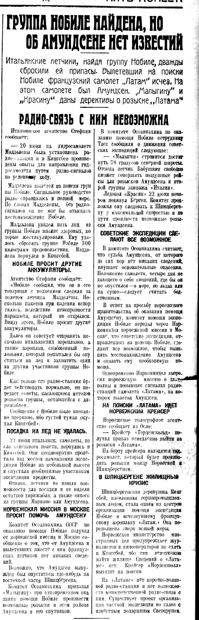 Общее количество людей, занятых в экспедициях по спасению спутников Нобиле, достигает шифры 1500. Результаты же пока ничтожны.