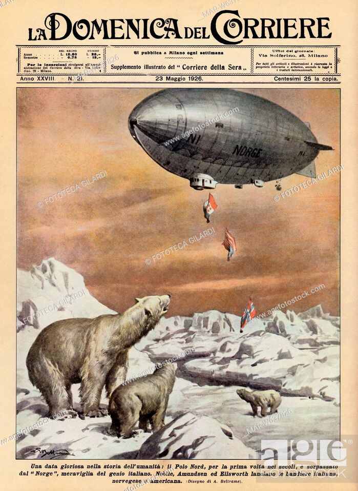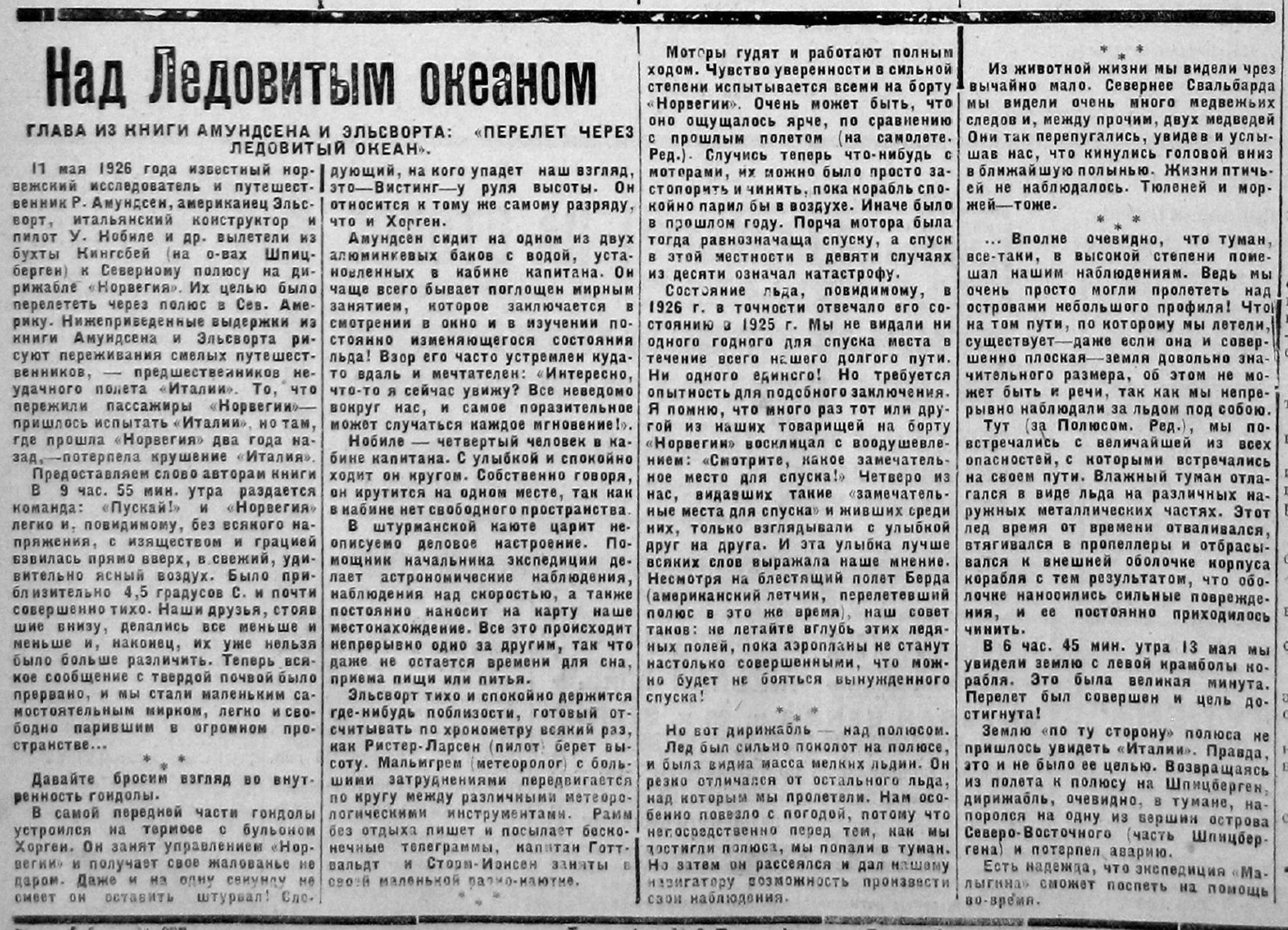 11 мая 1926 года известный норвежский исследователь и путешественник Р. Амундсен, американец Эльсворт, итальянский конструктор и пилот У. Нобиле и др. вылетели из бухты Кингсбей (на о-вах Шпицберген) к Северному полюсу на дирижабле "Норвегия". Их целью было перелететь через полюс в Сев. Америку. Нижеприведенные выдержки из книги Амундсена и Эльсворта рисуют переживания смелых путешественников, — предшественников неудачного полета "Италии". То, что пережили пассажиры "Норвегии" — пришлось испытать "Италии", но там, где прошла "Норвегия" два года назад, - потерпела крушение "Италия".