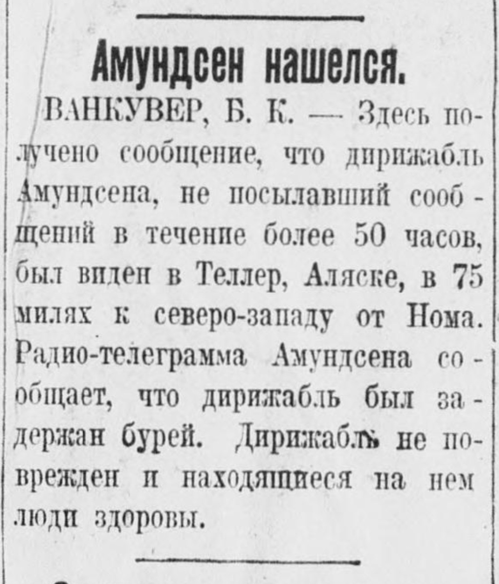 НЫО-ИОРК, 17 мая. Газета «Нью-Иорк-Таймс» передает следующие подробности об экспедиции Амундсена: «Дирижабль "Норвегия" прибыл в Теллер (небольшое селение эскимосов на Аляске, в 60 милях в северо-западу от Нома) спустя 71 час. после отлета из Ингсбей.