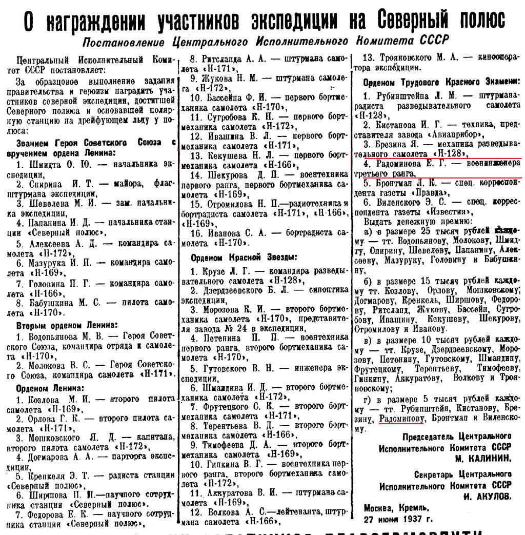 Когда этот почтенного вида пожилой мужчина вошел в редакционный кабинет в сопровождении ветерана АЛСИБа (трассы Аляска - Сибирь) Николая Яковлевича Почтаря и после короткого знакомства протянул мне почти истлевшую газету "Известия" за 28 июня 1937 года, я не сразу поверил своим глазам - с пожелтевшей фотографии на меня смотрело в числе прославленных полярников во главе с Героями Советского Союза Отто Шмидтом и Иваном Папаниным то же самое лицо, но только моложе. А внизу подпись: военный инженер 3 ранга Радоминов Евгений Гаврилович. Еще ниже - строки из постановления ЦИК СССР: "За образцовое выполнение задания Правительства и героизм наградить участников Северной экспедиции, достигшей Северного полюса и основавшей полярную станцию на дрейфующем льду у полюса: Орденом Трудового Красного Знамени: ...4. Радоминова Е.Г. - военинженера 3 ранга. Выдать денежную премию в размере 5.000 рублей..." Оказалось, что для того, чтобы описать жизненный и боевой путь полковника в отставке Е. Радоминова, не хватит и целого номера нашей газеты. Ведь в будущем году ему исполнится 90 лет, из них 38 он отдал Вооруженным Силам. А география мест службы еще более впечатляет: Ирак, Иран, США, Румыния, Канада...