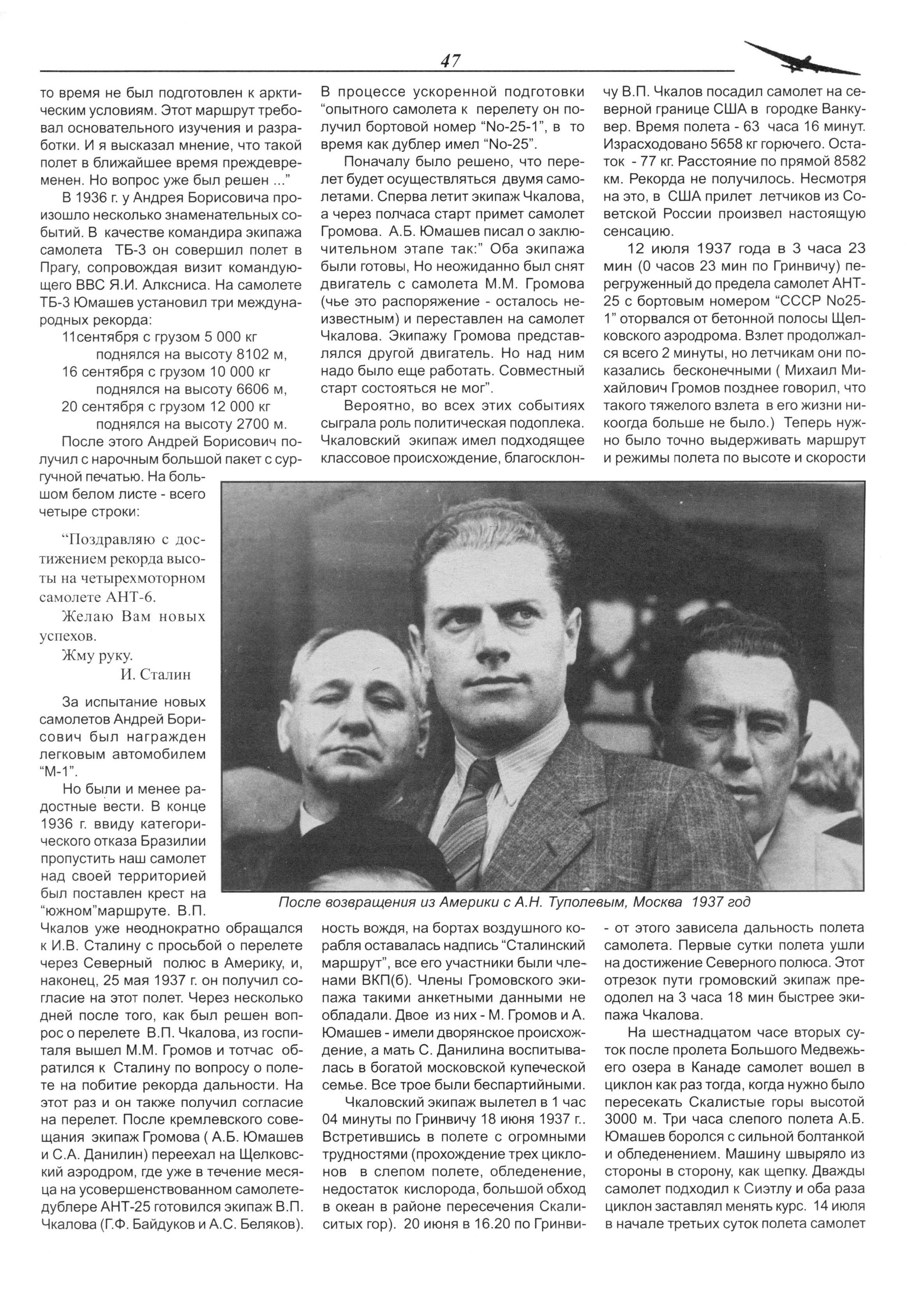 Но были и менее радостные вести. В конце 1936 г. ввиду категорического отказа Бразилии пропустить наш самолет над своей территорией был поставлен крест на "южном" маршруте. В. П. Чкалов уже неоднократно обращался к И. В. Сталину с просьбой о перелете через Северный полюс в Америку, и, наконец, 25 мая 1937 г. он получил согласие на этот полет. Через несколько дней после того, как был решен вопрос о перелете В. П. Чкалова, из госпиталя вышел М. М. Громов и тотчас обратился к Сталину по вопросу о полете на побитие рекорда дальности. На этот раз и он также получил согласие на перелет. После кремлевского совещания экипаж Громова ( А. Б. Юмашев и С. А. Данилин) переехал на Щелковский аэродром, где уже в течение месяца на усовершенствованном самолете- дублере АНТ-25 готовился экипаж В. П. Чкалова (Г. Ф. Байдуков и А. С. Беляков).
