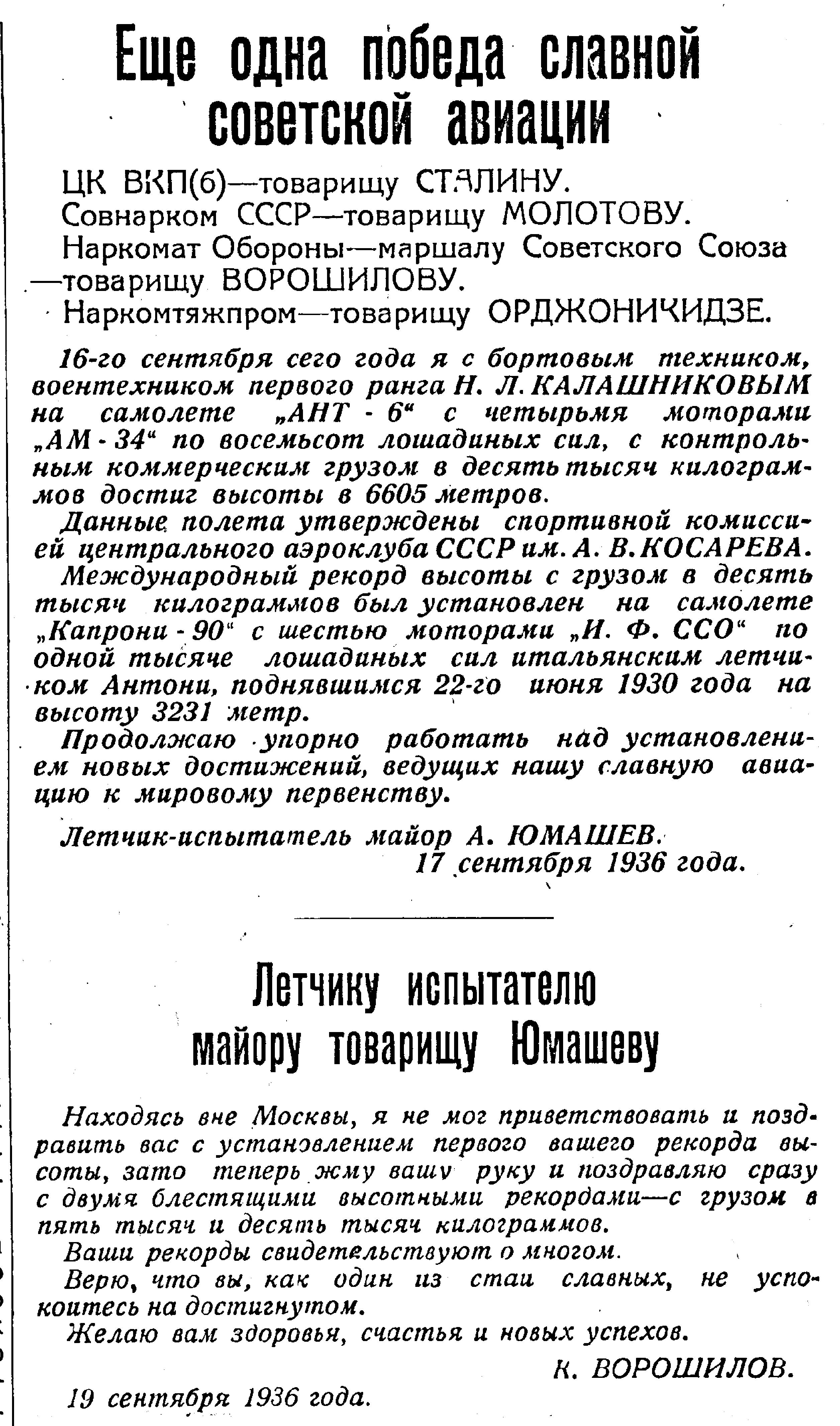"Поздравляю с достижением рекорда высоты на четырехмоторном самолете АНТ-6.