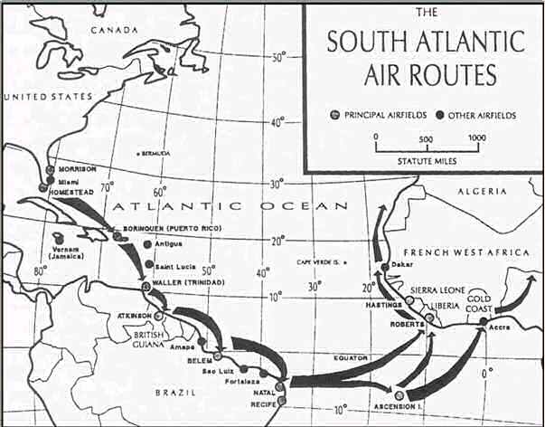 With the next returning group, in the summer of 1944, Colonel Maxim Chibisov arrived as the new commander of the ‘special aviation group’. It took him a few days to learn the procedures established under Colonel Vassilyev, and by that time the Northern Trans-Atlantic route was closing due to winter approaching and the danger of severe icing conditions in flight. So, a route was planned through the Caribbean to Brazil, across the south Atlantic Ocean, to the west coast of Africa – Morocco – Tunisia – and on to the Caspian or the Black Seas and Russia. It took an average of 40 days to deliver planes via this route. In addition the crews had to be flown back to the United States for the next trip. In general each crew made at least three trips via this route, the last being in the spring of 1945. One plane crashed on take-off from Elizabeth City, but 49 arrived safely.