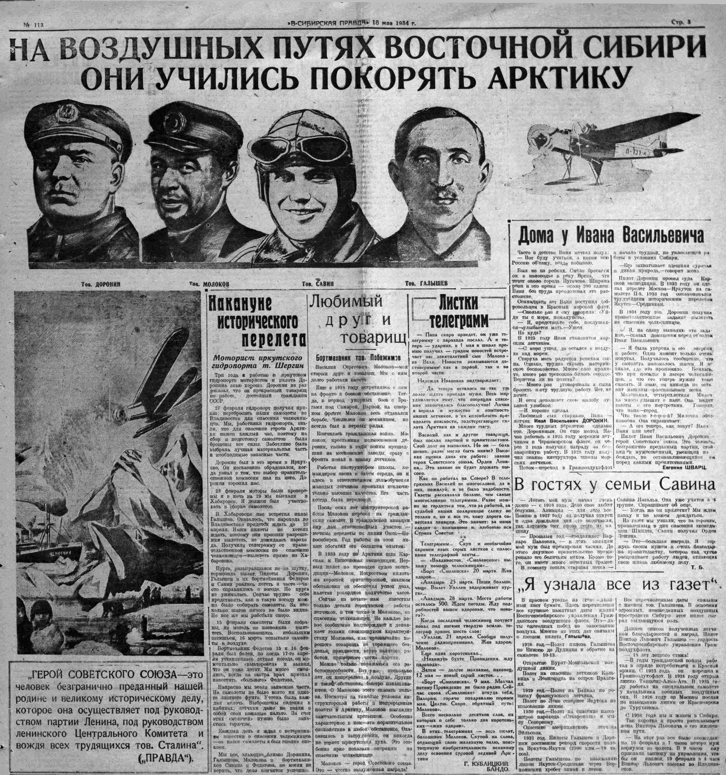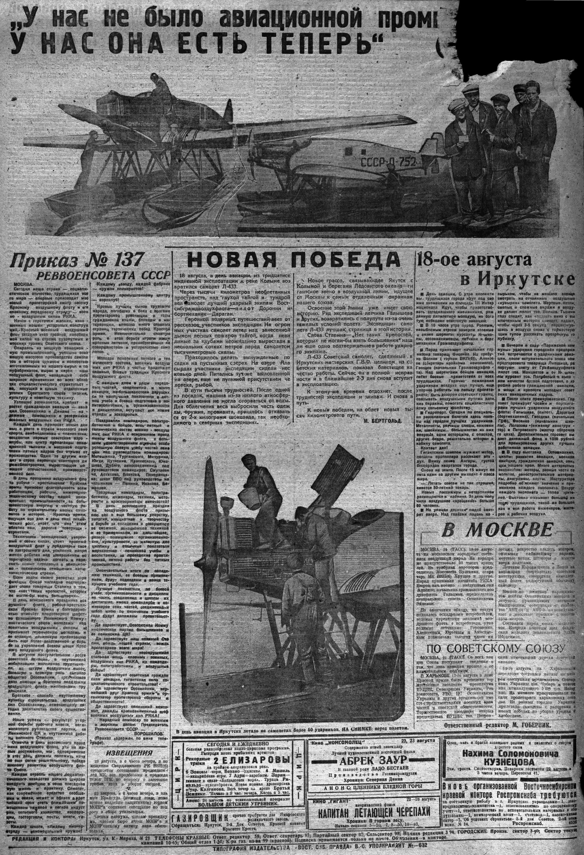 Необходимо добиться, чтобы газеты всех крупных городов и районов, где проходят и должны будут проходить воздушные линии и где будет работать производственная авиация, освещали апериодически вопрос об yспехах и недостатках авиационной работы, а главное о перспективах развития авиации. Целый ряд новых и не разрешаемых кабинетным путем вопросов развития гражданской авиации должны быть поставлены печатью, которая должна мобилизовать вокруг них внимание советской общественности. Об экономике и технике гражданской авиации и ее перспективах должен знать каждый трудящийся Восточной Сибири.