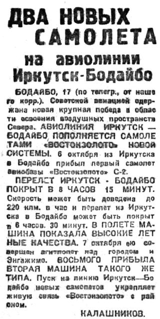 ПЕРЕЛЕТ ИРКУТСК - БОДАЙБО ПОКРЫТ В 8 ЧАСОВ 15 МИНУТ. Скорость может быть доведена до 220 клм. в час и перелет из Иркутска в Бодайбо может быть покрыт в 6 часов. 30 минут. В ПОЛЕТЕ МАШИНА ПОКАЗАЛА ВЫСОКИЕ ЛЕТНЫЕ КАЧЕСТВА. 7 октября ею совершен агитполет над городом и Энгажимо. ВОСЬМОГО ПРИБЫЛА ВТОРАЯ МАШИНА ТАКОГО ЖЕ ТИПА. Пуск на линию Иркутск — Бодайбо новых самолетов укрепляет живую связь «Востокзопото» с районом.