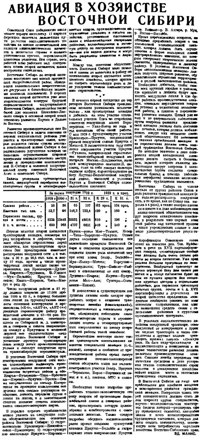 Восточная Сибирь не только отстала от других районов Союза в дело развития гражданской авиация (с 29 года не расширилась воздушная сеть, в то время, как по Союзу она выросла в 4 раза), а также позорно плетется в хвосте и в деле мобилизации внимания советской общественности вокруг вопросов авиационного хозяйства, в результате чего первый этап этой работы над пятилеткой прошел в тиши учрежденских комнат и дал мало удовлетворительные результаты.