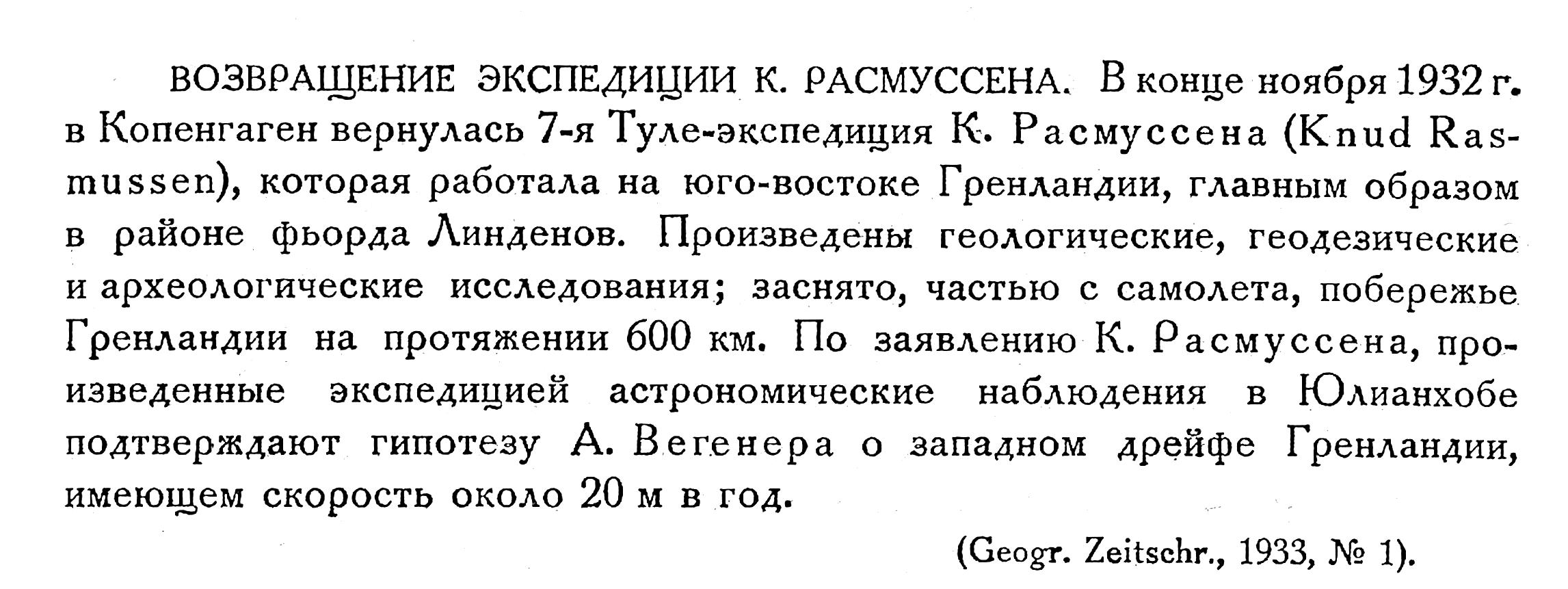 ВОЗВРАЩЕНИЕ ЭКСПЕДИЦИИ К. РАСМУССЕНА. В конце ноября 1932 г. в Копенгаген вернулась 7-я Туле-экспедиция К. Расмуссена (Knud Rasmussen), которая работала на юго-востоке Гренландии, главным образом в районе фьорда Линденов. Произведены геологические, геодезические и археологические исследования; заснято, частью с самолета, побережье Гренландии на протяжении 600 км. По заявлению К. Расмуссена, произведенные экспедицией астрономические наблюдения в Юлианхобе подтверждают гипотезу А. Вегенера о западном дрейфе Гренландии, имеющем скорость около 20 мм в год.