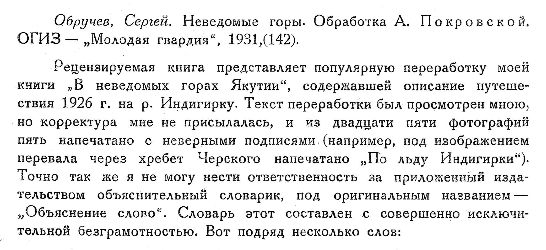 Рецензируемая книга представляет популярную переработку моей книги „В неведомых горах Якутии“, содержавшей описание путешествия 1926 г. на р. Индигирку. Текст переработки был просмотрен мною, но корректура мне не присылалась, и из двадцати пяти фотографий пять напечатано с неверными подписями , (например, под изображением перевала через хребет Черского напечатано „По льду Индигирки"). Точно так же я не могу нести ответственность за приложенный издательством объяснительный словарик, под оригинальным названием — „Объяснение слово". Словарь этот составлен с совершенно исключительной безграмотностью. Вот подряд несколько слов: