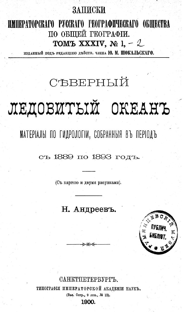 Андреев Н.П. Северный Ледовитый океан. Материалы по гидрологии, собранные в период с 1889 по 1893 год. Записки Имп.Русского Географ. общества по Общей Географии. Том XXXIY, вып. 1. Спб.1900.