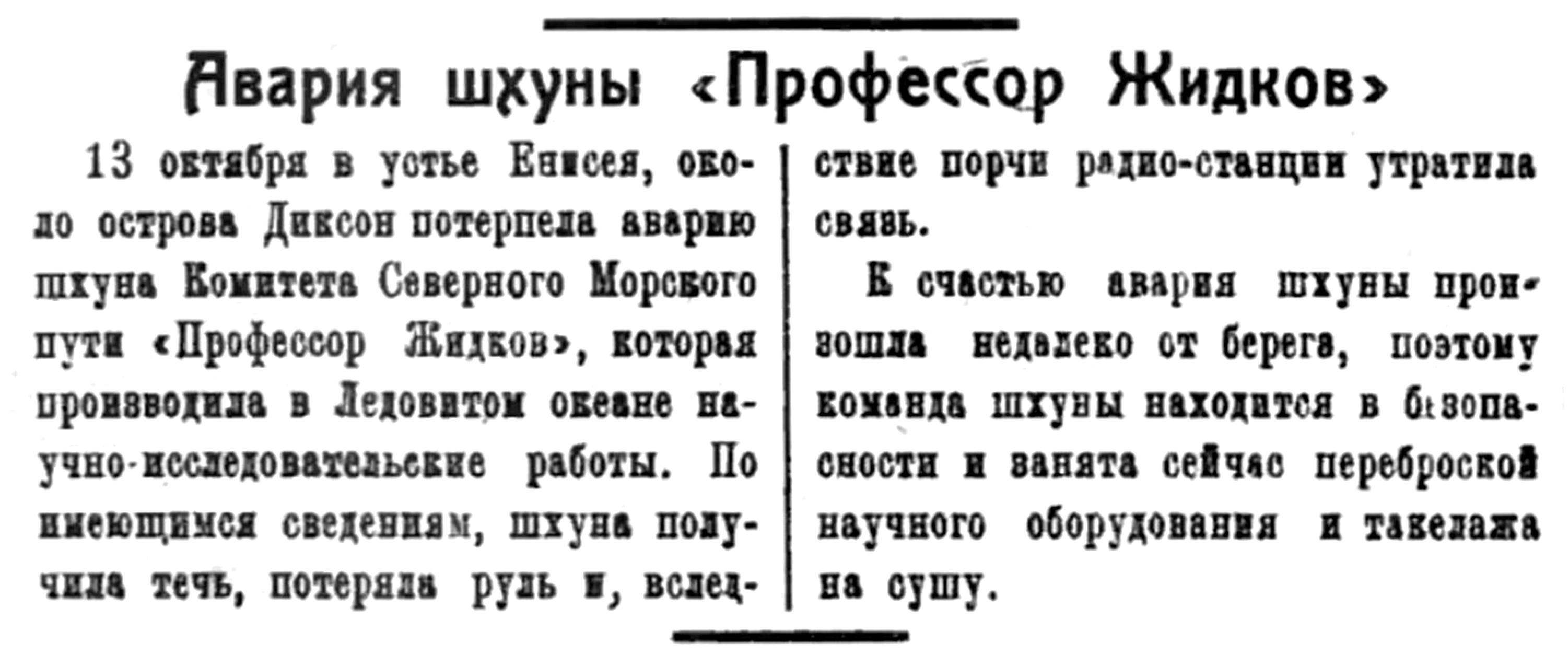 13 октября в устье Енисея, около острова Диксов потерпела аварию шхуна Комитета Северного Морского пути "Профессор Жидков", которая производила в Ледовитом океане научно-исследовательские работы. По имеющимся сведениям, шхуна получила течь, потеряла руль и, вследствие порчи радио-станции утратила связь.