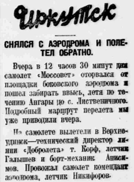 На самолете вылетели в Верхнеудинск — технический директор линии «Добролета» т. Корф, летчик Галышев и борт-механик Анисимов. Провожал самолет комендант аэродрома, летчик Никифоров.