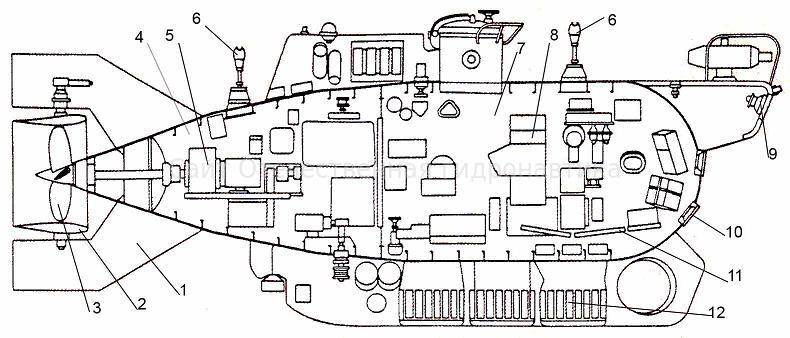 1 – вертикальный стабилизатор; 2 – поворотная насадка; 3 – маршевый винт; 4 – агрегатный отсек; 5 – электродвигатель маршевого винта; 6 – шток погрузочного устройства; 7 – отсек экипажа; 8 – пульт командира; 9 – светильник; 10 – иллюминатор; 11 – место наблюдателя; 12 – АБ.