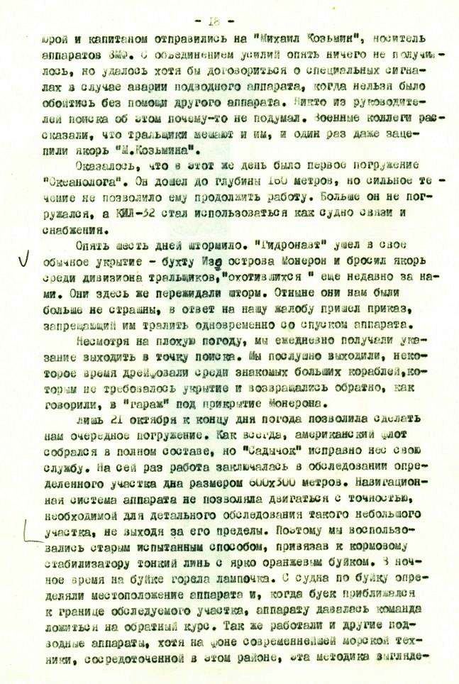 Утешало лишь то, что беспомощность и непредсказуемость действий нашего руководства одинаково мешали как нам, так и американцам. Если им и удавалось что-то нащупать своими приборами, то на следующий день этого на дне уже не было, так как было утащено тралами, а куда, [ххххххххх] никто не знал. В результате такой организации самолет в течение первого месяца поисков найден не был.