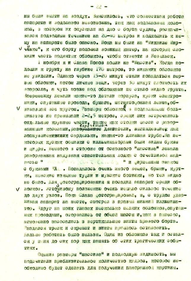 1 ноября я и Слава Попов пошли на "Массив". Когда подошли к грунту на глубине 170 метров, то никаких обломков не увидели. Однако через 15-20 минут стали попасться первые обломки, потом личные вещи. Через 30 минут плотность их возросла, а чуть позже под обломками не стало видно грунта. Вперемешку лежали какие-то детали корпуса, куски электроники, спутанные провода, бумага, магнитофонная лента,обвивающая все кругом. Размеры обломков в подавляющем большинстве не превышали 2-2,5 метров, среди них встречались отдельные крупные части, такие как стойки шасси с разорванными колесами, развороченные двигатели, выглядевшие как лопнувшие[ххххххх] сардельки, какая-то длинная труба. На некоторых кусках обшивки с иллюминаторами были видны буквы и цифры. Немного в стороне от основного "массива" лежала разорванная надувная спасательная лодка с отчетливой надписью ""и фирменным знаком с буквами КА?. Попадалось очень много вещей, брюки, куртки, женские изящные туфли и мужские ботинки, но тел видно не было. Для фотографирования я посадил аппарат среди обломков, устойчивому положению очень мешало сильное течение до двух узлов. Пока Слава фотографировал, я, с трудом удерживая аппарат на месте, смотрел в правый нижний иллюминатор. Вдруг на моих глазах несколько мелких обломков, опутанных проводами, оторвались от общей массы и, как в пылесос, мгновенно засосались в вертикальные винты правого борта. Раздался треск и скрежет и винты пришлось остановить, дальше работать было нельзя. Один из обломков так и остался у меня до сих пор как память об этих трагических событиях.