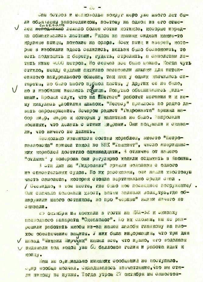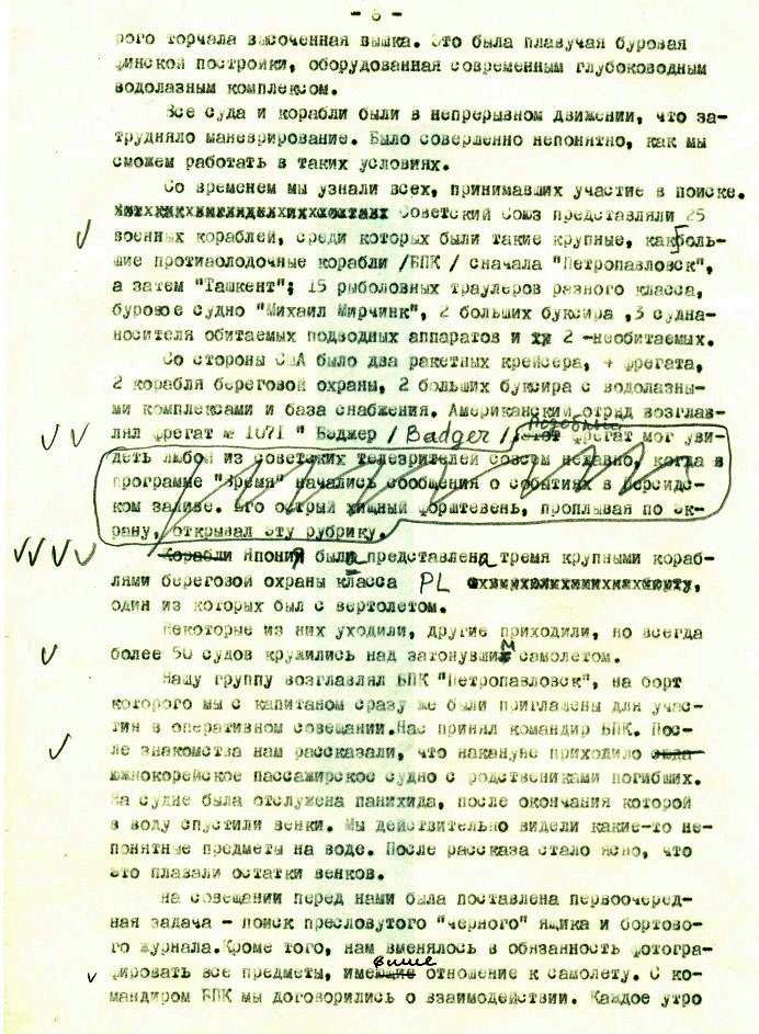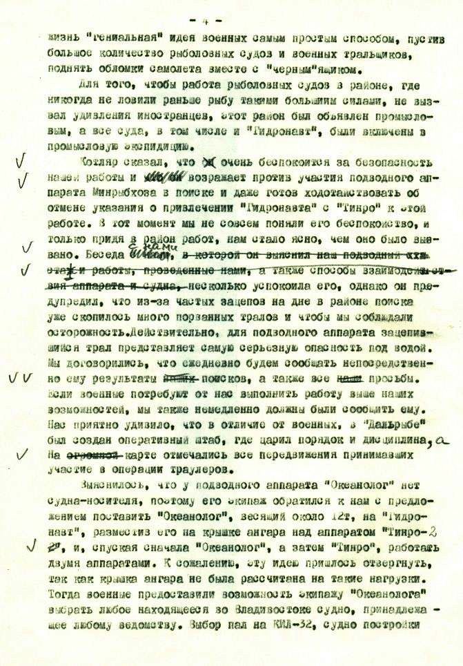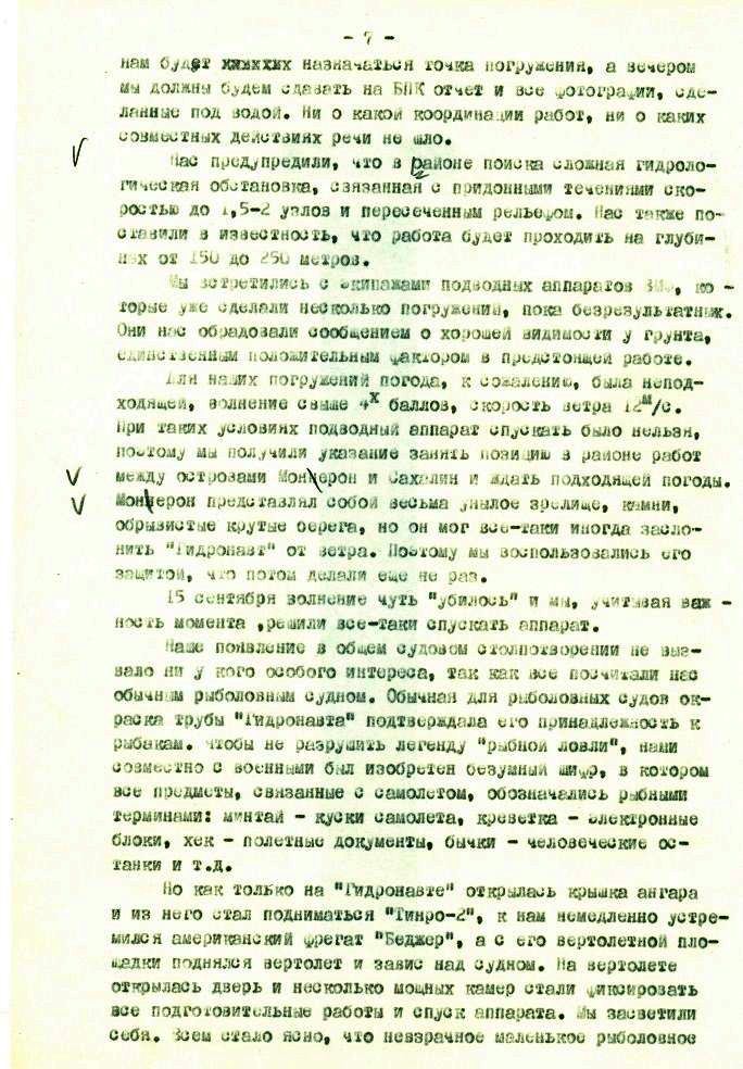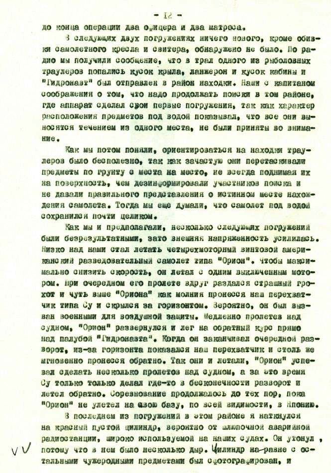 Утешало лишь то, что беспомощность и непредсказуемость действий нашего руководства одинаково мешали как нам, так и американцам. Если им и удавалось что-то нащупать своими приборами, то на следующий день этого на дне уже не было, так как было утащено тралами, а куда, [ххххххххх] никто не знал. В результате такой организации самолет в течение первого месяца поисков найден не был.