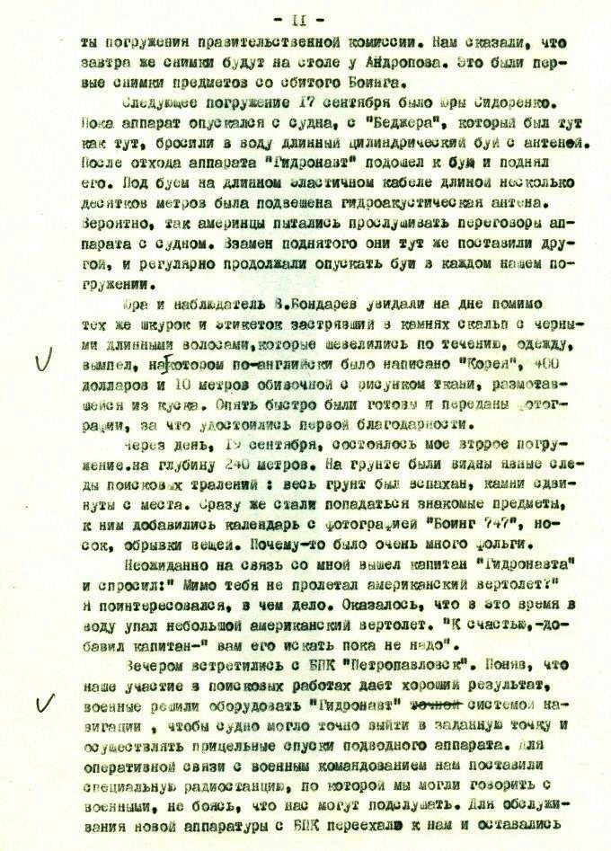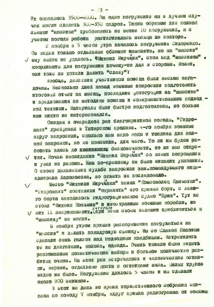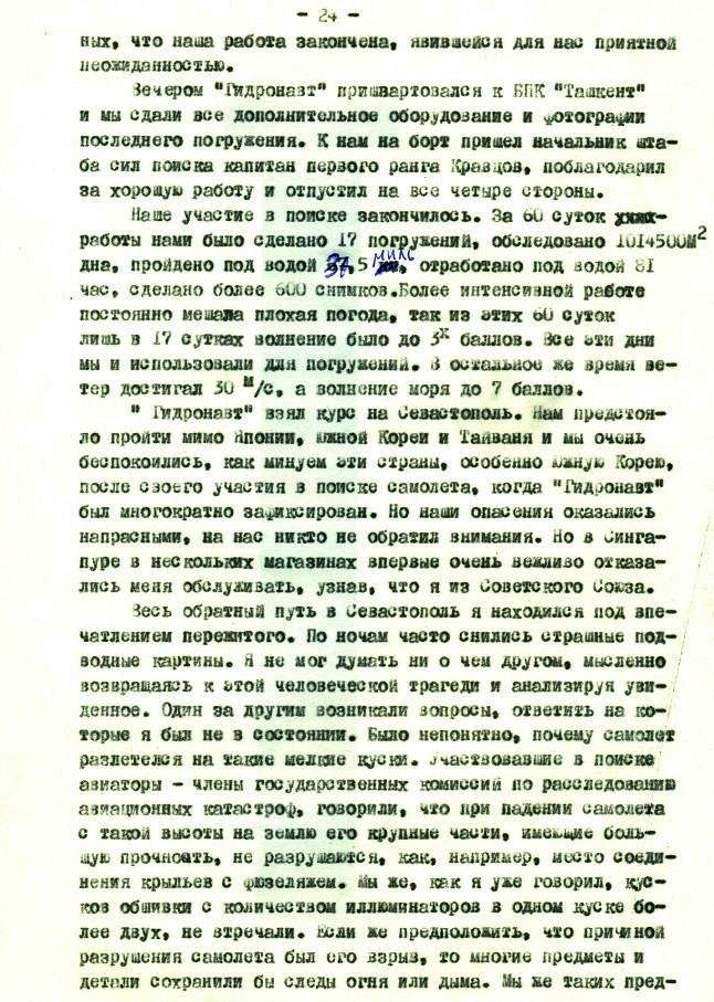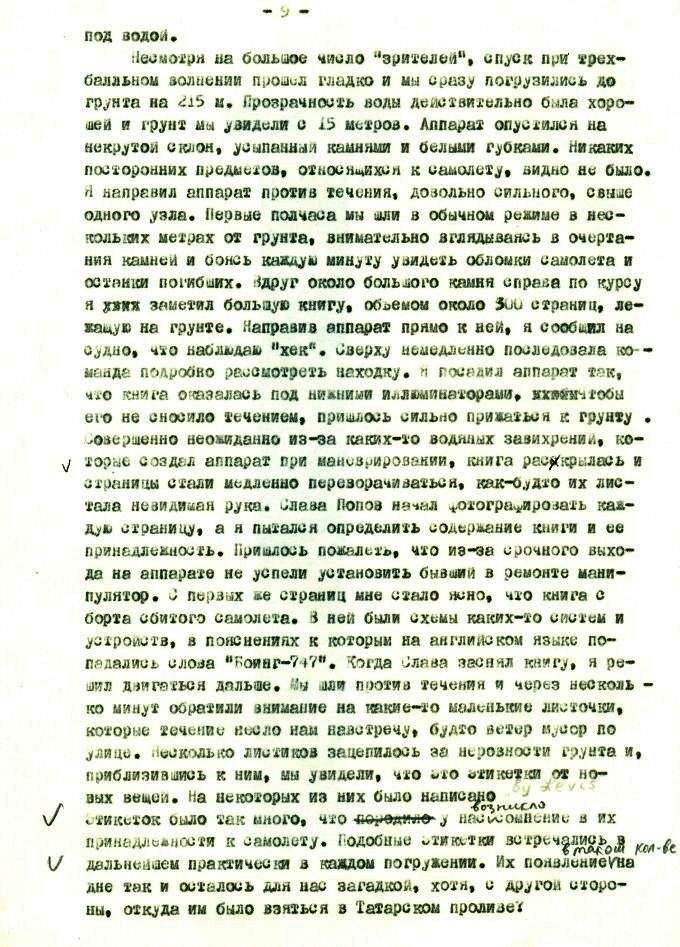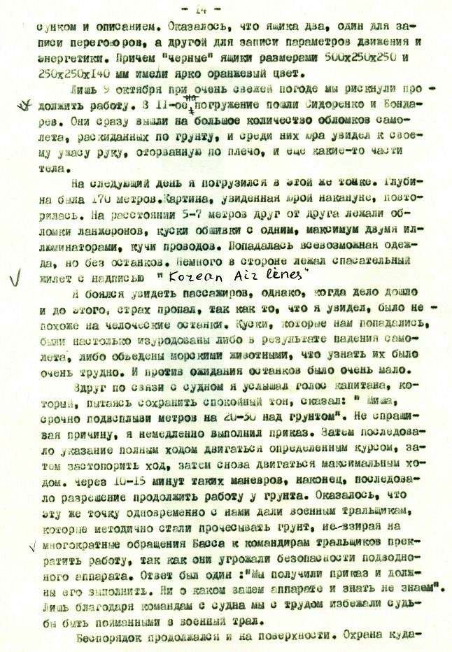 1 ноября я и Слава Попов пошли на "Массив". Когда подошли к грунту на глубине 170 метров, то никаких обломков не увидели. Однако через 15-20 минут стали попасться первые обломки, потом личные вещи. Через 30 минут плотность их возросла, а чуть позже под обломками не стало видно грунта. Вперемешку лежали какие-то детали корпуса, куски электроники, спутанные провода, бумага, магнитофонная лента,обвивающая все кругом. Размеры обломков в подавляющем большинстве не превышали 2-2,5 метров, среди них встречались отдельные крупные части, такие как стойки шасси с разорванными колесами, развороченные двигатели, выглядевшие как лопнувшие[ххххххх] сардельки, какая-то длинная труба. На некоторых кусках обшивки с иллюминаторами были видны буквы и цифры. Немного в стороне от основного "массива" лежала разорванная надувная спасательная лодка с отчетливой надписью ""и фирменным знаком с буквами КА?. Попадалось очень много вещей, брюки, куртки, женские изящные туфли и мужские ботинки, но тел видно не было. Для фотографирования я посадил аппарат среди обломков, устойчивому положению очень мешало сильное течение до двух узлов. Пока Слава фотографировал, я, с трудом удерживая аппарат на месте, смотрел в правый нижний иллюминатор. Вдруг на моих глазах несколько мелких обломков, опутанных проводами, оторвались от общей массы и, как в пылесос, мгновенно засосались в вертикальные винты правого борта. Раздался треск и скрежет и винты пришлось остановить, дальше работать было нельзя. Один из обломков так и остался у меня до сих пор как память об этих трагических событиях.
