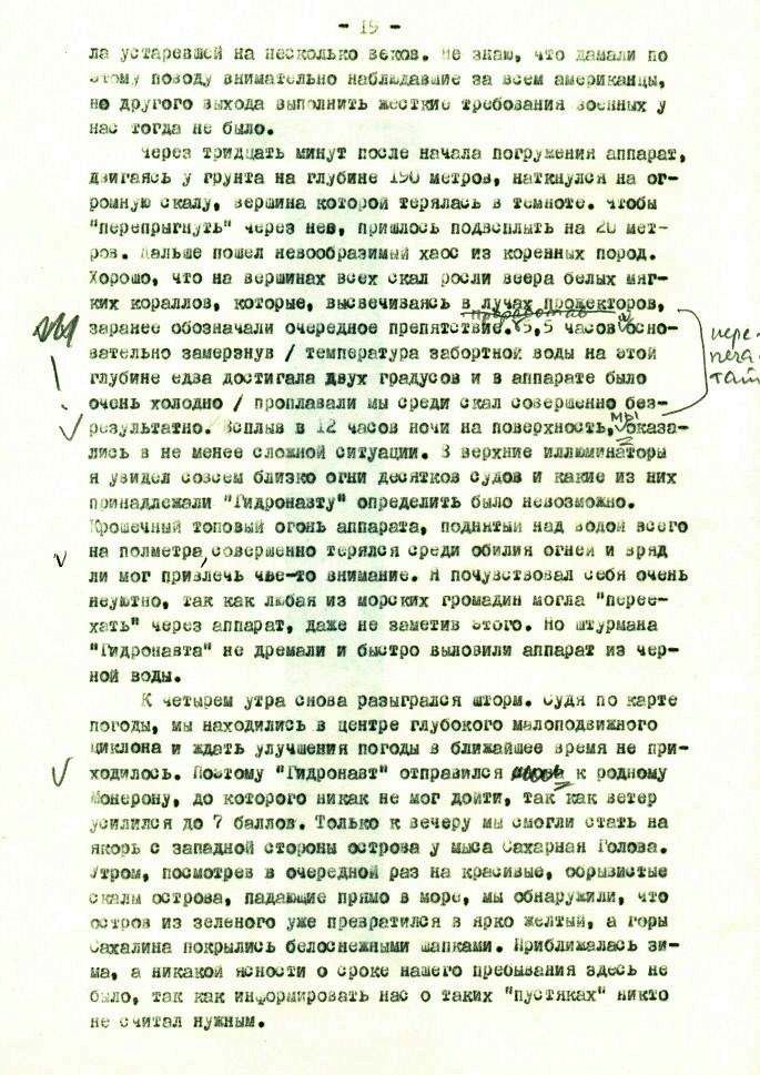 Команду судна и экипаж подводного аппарата охватило сильное волнение. Оно было вызвано не столько неопределенностью дальнейшей жизни, как необычностью полученного задания. До сих пор аппарат использовался исключительно для биологических исследований по определению запасов промысловых объектов и наблюдениями за работой орудии лова. Но я был уверен, что богатейший опыт, приобретенный [мною] нами под водой в предыдущих десяти рейсах, когда приходилось погружаться в самых разных, порой очень сложных условиях, высокая квалификация судовых специалистов и надежность нашей подводной техники помогут нам и в этом случае,[хорошо выполнить работу].