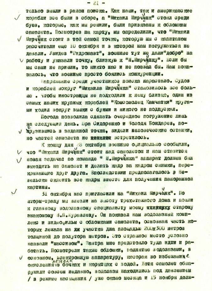 31 октября нас пригласили на "Михаил Мирчинк". По шторм-трапу мы влезли на высоту трехэтажного дома и пошли к главному водолазному специалисту моему [хххххххх] старому знакомому В.П. Журавлеву. Он показал нам водолазный комплекс и видеофильм с обломками самолета, основная часть которых лежала на [хх] участке дна площадью 200х300 метров толщиной до полутора метров. Это страшное место условно назвали "массивом". Завтра мне предстояло туда идти и работать. Посмотрели также обломки, поднятые водолазами, в основном, электронную аппаратуру, которая во избежание окисления лежала в бочках и корытцах с водой. Хотя самолет обнаружили совсем недавно, водолазы находились под давлением /в режиме насыщения/ уже около месяца и 15 ноября долж-