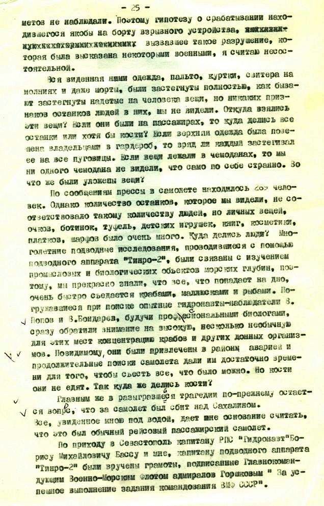 По сообщениям прессы в самолете находилось 269 человек. Однако количество останков, которое мы видели, не соответствовало такому количеству людей, но личных вещей, очков, ботинок, туфель, детских игрушек, книг, косметики, платков, шарфов было очень много. Куда делись люди? Многолетние подводные исследования, проводившиеся с помощью подводного аппарата "Тинро-2", были связаны с изучением промысловых и биологических объектов морских глубин, поэтому, мы прекрасно знали, что все, что попадает на дно, очень быстро съедается крабами, моллюсками и рыбами. Погружавшиеся при поиске опытные гидронавты-наблюдатели Попов и В. Бондарев, будучи профессиональными биологами, сразу обратили внимание на высокую, несколько необычную для этих мест концентрацию крабов и других донных организмов. Повидимому, они были привлечены в район аварией и продолжительные поиски самолета дали им достаточно времени для того, чтобы съесть все, что было можно. Но кости они не едят. Так куда же делись кости?