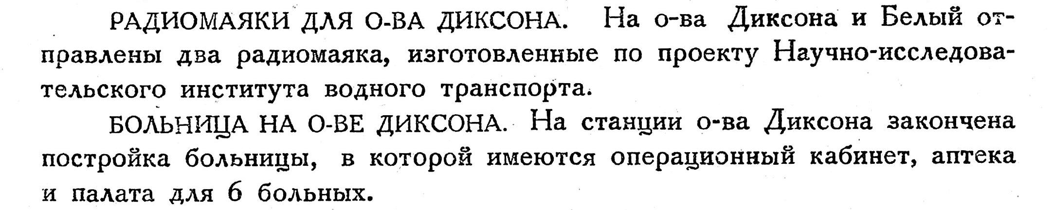 БОЛЬНИЦА НА О-ВЕ ДИКСОНА. На станции о-ва Диксона закончена постройка больницы, в которой имеются операционный кабинет, аптека и палата для 6 больных.