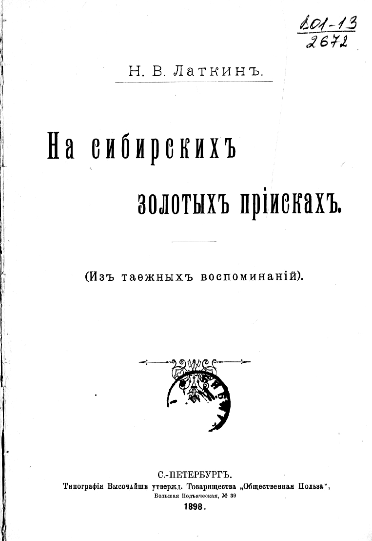 Латкин Н.В., "Енисейская губерния, ее прошлое и настоящее" / очерк , чл. Имп. Рус. геогр. о-ва. - С.-Петербург : тип. и лит. В. А. Тиханова, 1892. - [2], II, IV, 467 с. ; Библиогр. в предисл. .