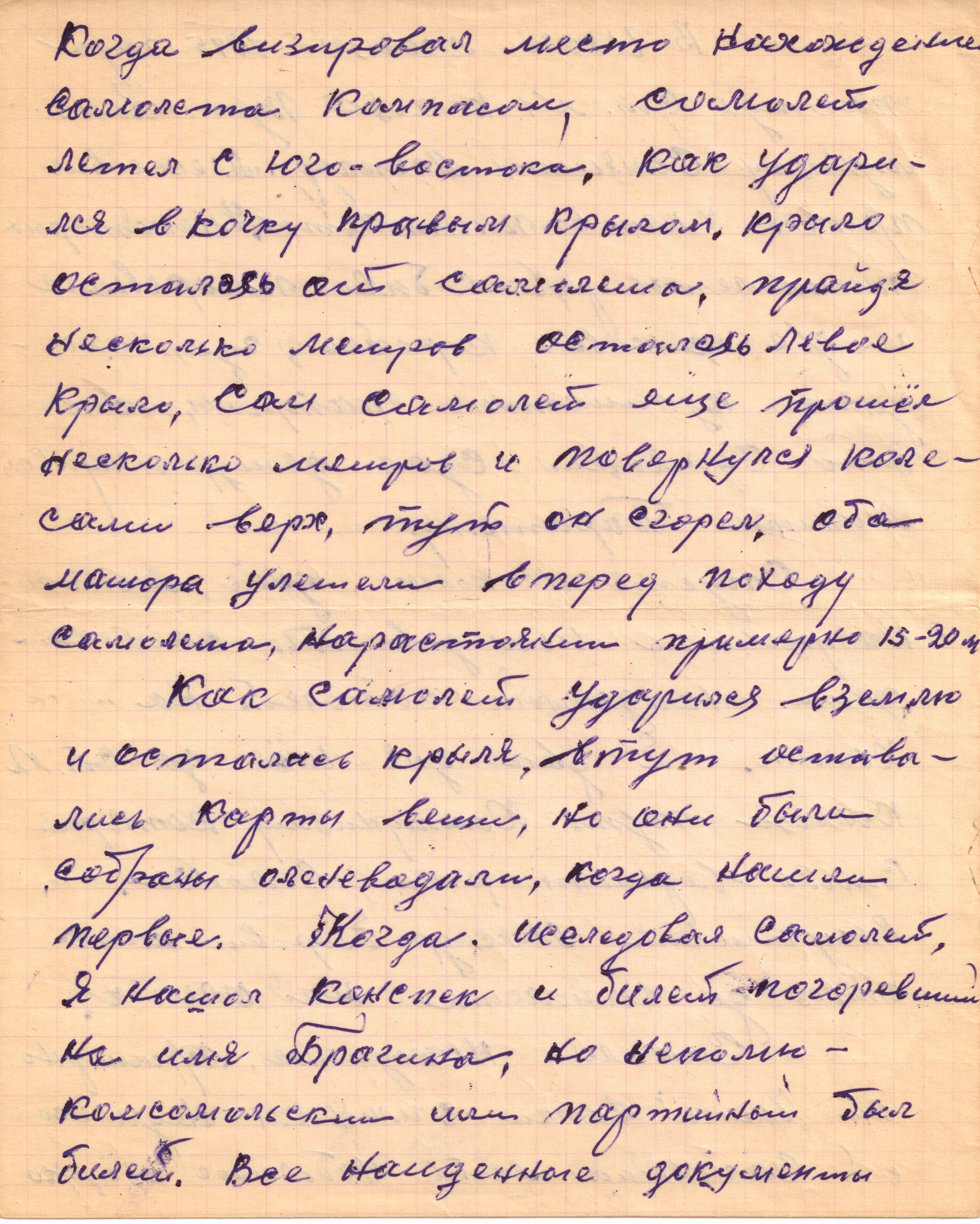 Как самолет ударился в землю и остались крылья. Тут оставались карты, вещи, но они были собраны оленеводами, когда нашли первые. Когда исследовал самолет я нашел Конспек (?) и билет погоревший, на имя Брагина, но не помню – комсомольский или партийный был билет. Все найденные документы и карты я привез в Нижнюю-Пешу и вместе с рапортом отдал начальнику милиции Сидорову.
