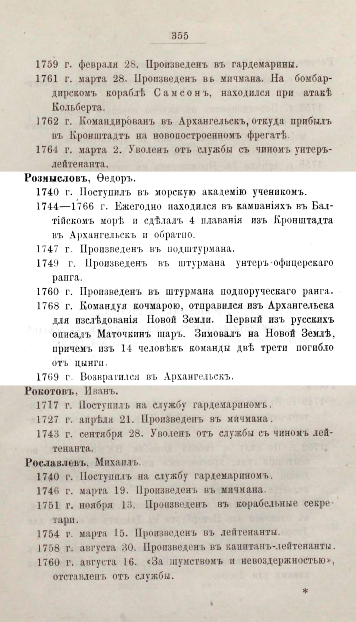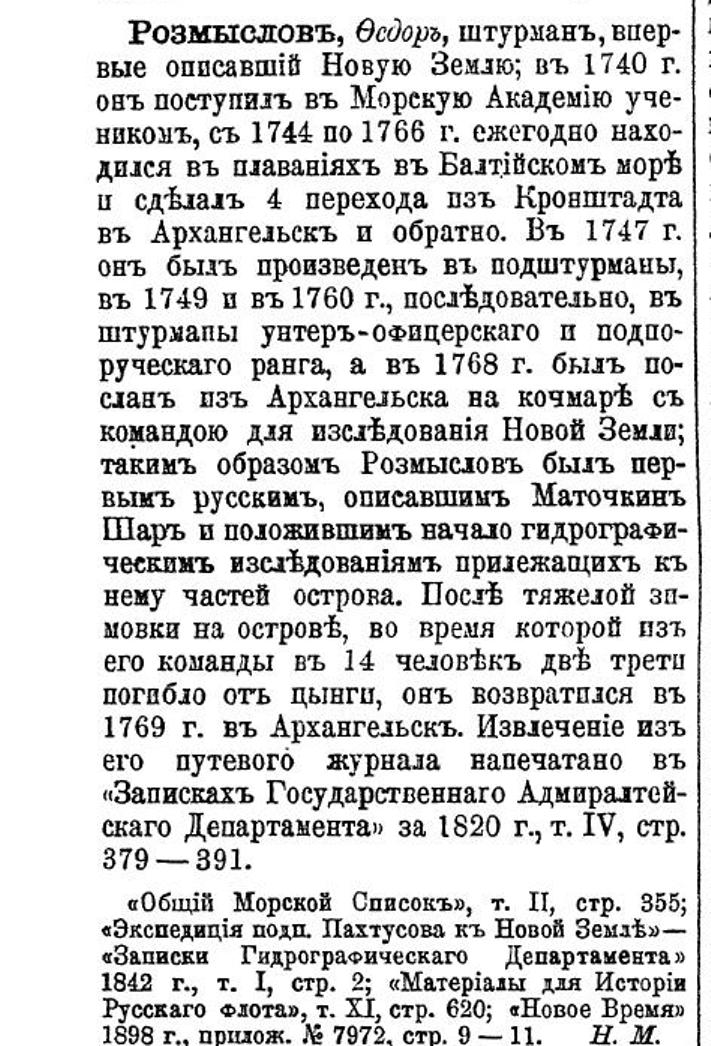 Справка. Фёдор Тимофеевич Розмыслов – штурман подпоручицкого ранга, путешественник XVIII века, положивший основание русским исследованиям Новой Земли. В 1744 году окончил Морскую академию. Служил в Кронштадтской и Ревельской эскадрах. Был штурманом на линейных кораблях. Участвовал в Семилетней войне (1756–1763 годы) с Пруссией. Принимал участие в перегонах новопостроенных кораблей из Архангельска на Балтику. Погиб в октябре 1771 года во время кораблекрушения у острова Гогланд в Финском заливе.