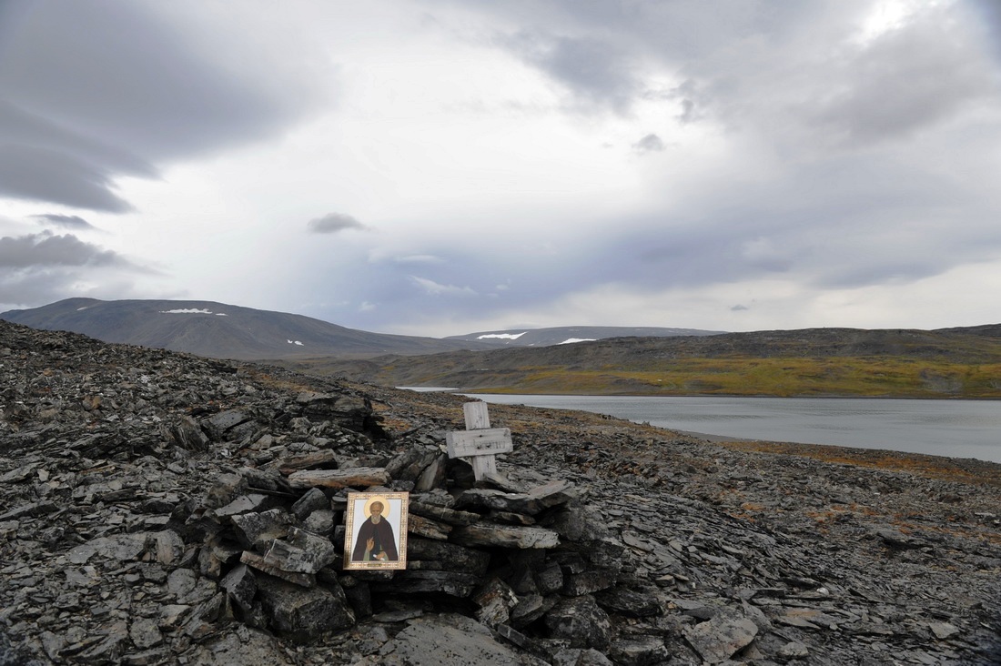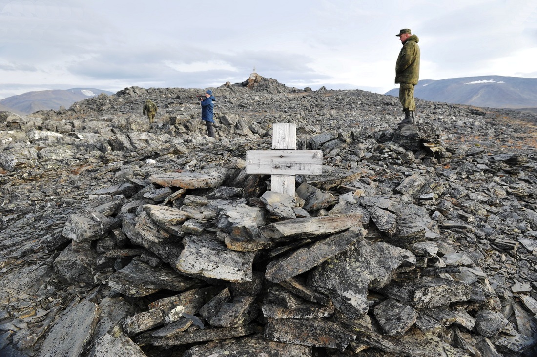 Перекусив и размяв ноги, все начали восхождение на сопку к месту захоронения членов экспедиции Фёдора Розмыслова. Погода тем временем начала меняться. Вскоре подул пронизывающий ветер, нагнавший серые, а вдали над горами и почти чёрные снежные тучи. Периодически накрапывал дождь. Зима здесь уже на пороге.