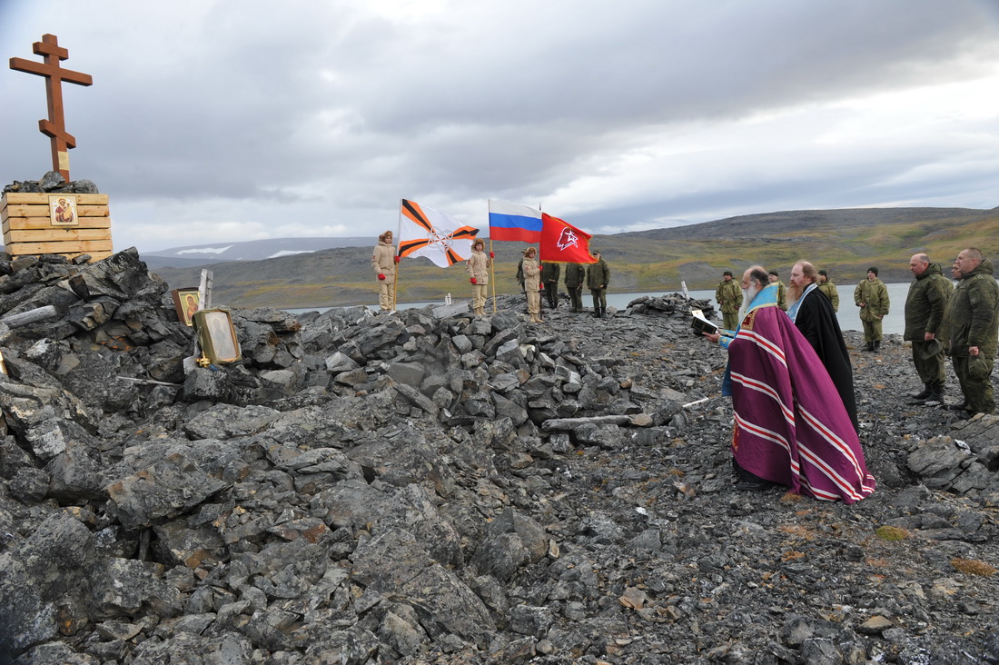 Владыка Иаков освятил крест, полковник Шуркалин дал команду юнармейцам приспустить флаги, а военнослужащие дали в небо несколько залпов из автоматов. Таким образом, были отданы и воинские почести героям русской Арктики.