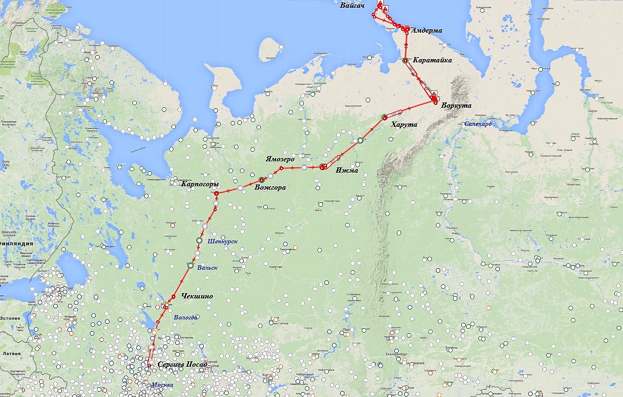 Маршрут: г.Сергиев-Посад(Московск. обл) - д.Чекшино(Вологодск. обл) - с.Карпогоры(Архангельск. обл) - с.Вожгора(Архангельск. обл) - Ямозеро(Коми) - Ижма(Коми)- Харута(НАО) - Воркута - Амдерма - Остров Вайгач -Амдерма- Каратайка - Воркута.