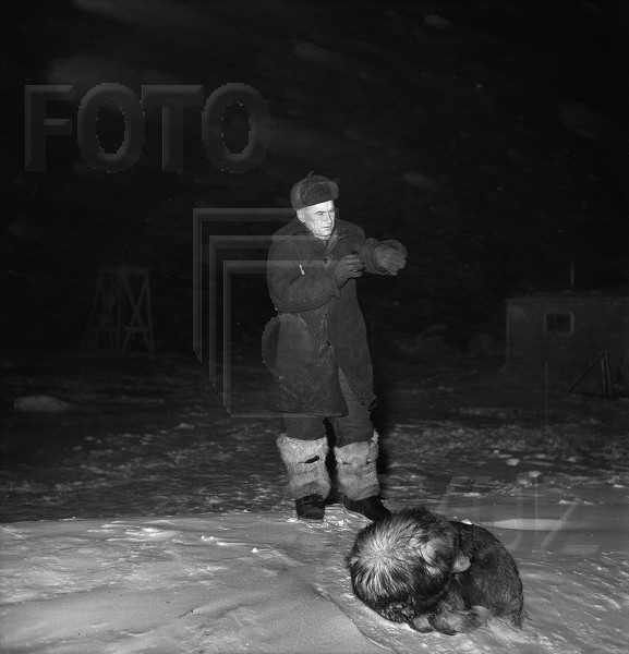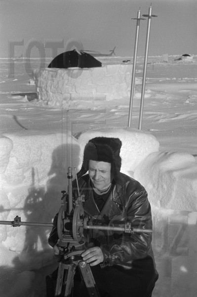 Научно-исследовательская дрейфующая полярная станция "Северный Полюс-3". Фотограф Яков Рюмкин на Северном полюсе. Апрель 1954