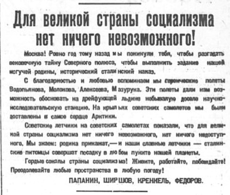 Впервые в истории человечества на Северный полюс прибыл целый коллектив — 35 отважных, отлично подготовленных полярных исследователей, ученых, авиаторов... Советские люди с честью справились с очень трудным и рискованным предприятием, сыгравшим важную роль для отечественной науки и престижа Страны Советов.