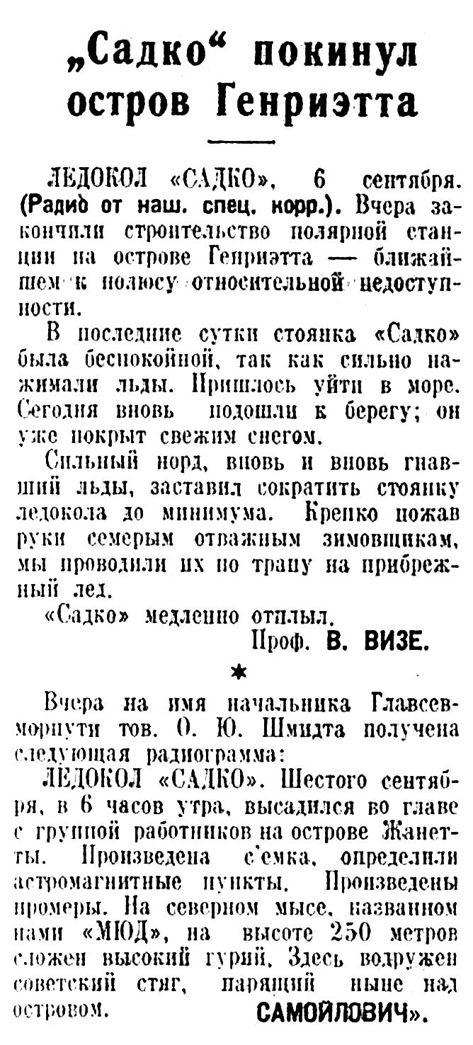 ЛЕДОКОЛ «САДКО». Шестого сентября, в 6 часов утра, высадился во главе с группой работников на острове Жанетты. Произведена съемка, определили астромагнитные пункты. Произведены промеры. На северном мысе, названном нами «МЮД», на высоте 250 метров сложен высокий гурий. Здесь водружен советский стяг, парящий ныне над островом.